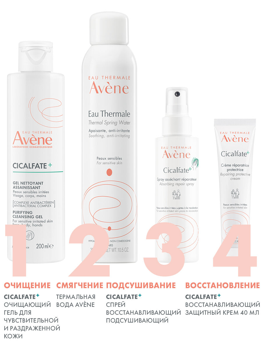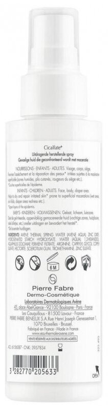 Для чувствительной, раздраженной и поврежденной кожи младенцев, детей и взрослых. Мокнущие поверхностные повреждения кожи лица, тела и наружных слизистых, включая зону под подгузником, кожные складки. Свойства: спрей Cicalfate+ подсушивает и восстанавливает раздраженные участки кожи, склонные к мацерации (мокнутию). Бесконтактно наносится, быстро впитывается, возвращает раздраженной коже чувство комфорта и ускоряет восстановление. Компоненты: [С+ - Restore]TM эффективный постбиотический восстанавливающий ингредиент, полученный из термальной воды Авен позволяет быстро восстановить кожу и наружные слизистые Комплекс сульфата меди и сульфата цинка ограничивают риск бактериального распространения Термальная вода Авен в составе успокаивает, смягчает, снимает раздражение Абсорбирующие частицы дополнительно подсушивают раздраженные участки. Не вызывает жжения кожи.