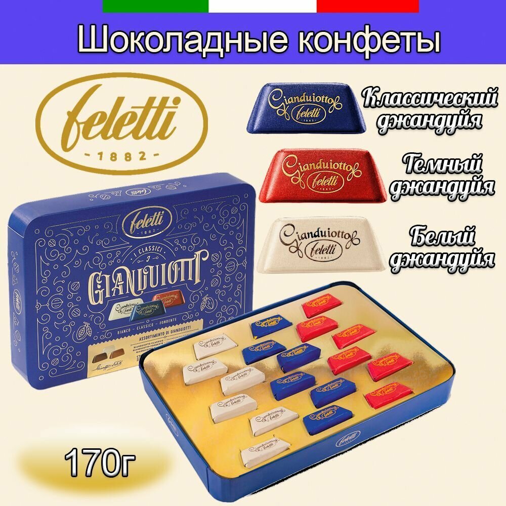 Feletti - это итальянский бренд конфет, который производит широкий ассортимент конфет разных вкусов и форм. Они известны своей качественной продукцией и высоким уровнем вкуса. Feletti производит конфеты из различных видов шоколада, включая молочный, темный и белый, а также из орехов и сухофруктов.Ассорти итальянских шоколадных конфет Feletti:* Классические шоколадные конфеты Gianduia,* Шоколад в темном шоколаде Gianduia,* Шоколад в белом шоколаде Gianduia,Gianduiotto-это тип шоколада, типичный для северо-западной Италии (Пьемонт). Они имеют форму перевернутые лодки и завернуты в золотую или серебряную фольгу. Их получают путем смешивания сахара, какао и специальные орехи под названием Tonda Gentile del Piemonte, типичные только для этого регион.
