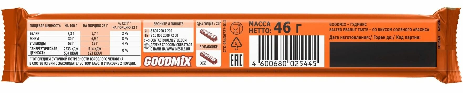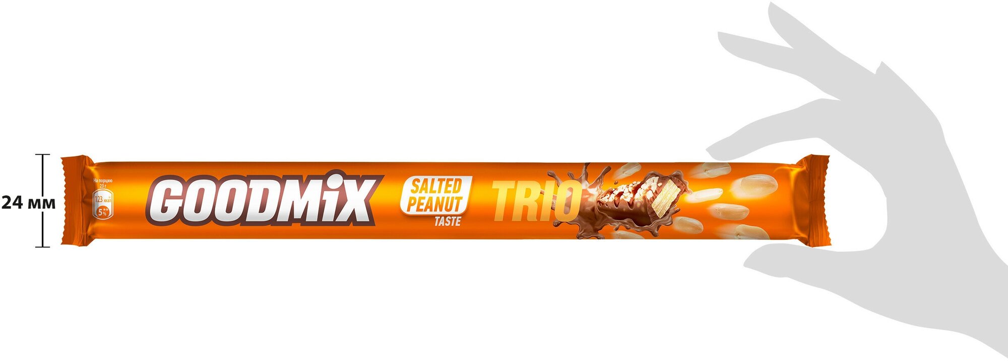 Шоколадный батончик GOODMIX TRIO с арахисом и хрустящей вафлей. Конфета GOODMIX SALTED PEANUT taste со вкусом соленого арахиса и с хрустящей вафлей.GOODMIX солёный арахис в формате трио – это оригинальный микс нежного молочного шоколада и хрустящей вафли, декорированных кусочками арахиса, в еще большем размере!Батончик GOODMIX - отличный вариант для быстрого утоления голода, которым можно поделиться и с друзьями! Насладитесь вкусным батончиком GOODMIX от известного производителя кондитерских изделий!Без искусственных красителей, ароматизаторов и консервантов.Компания «Нестле» является одним из крупнейших производителей в таких кондитерских категориях, как шоколадные плитки, батончики, конфеты в коробках и жевательный мармелад. Внеся значительный вклад в историю развития шоколада, мы продолжаем радовать наших потребителей, предлагая широкий ассортимент любимых вкусов