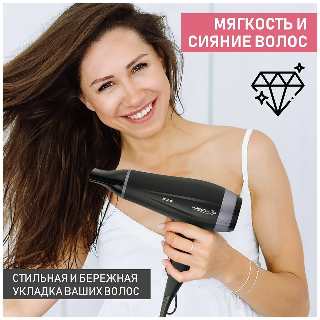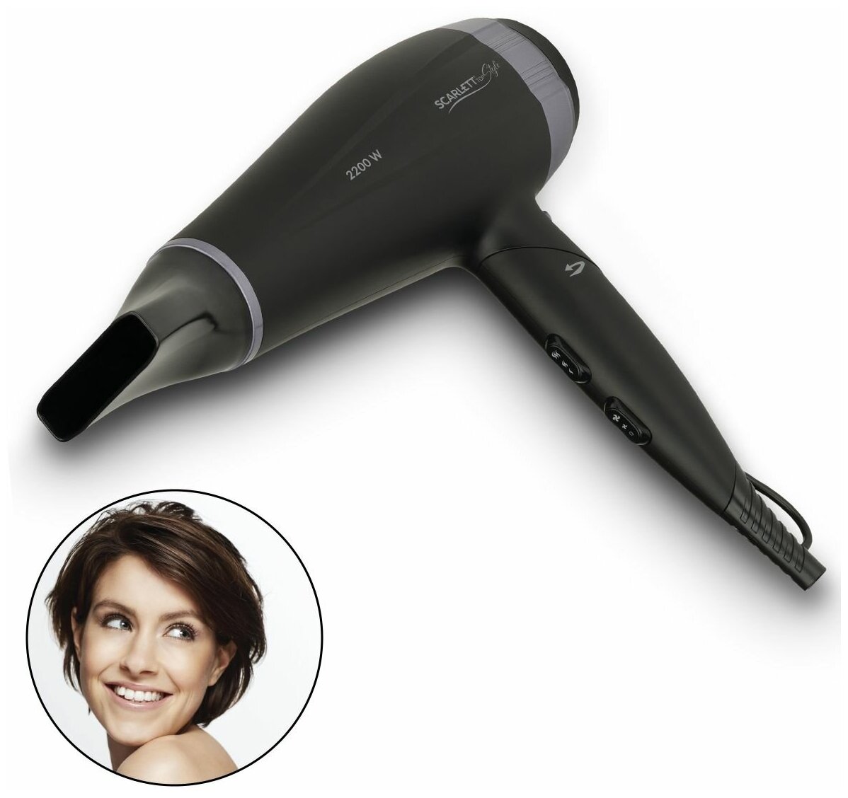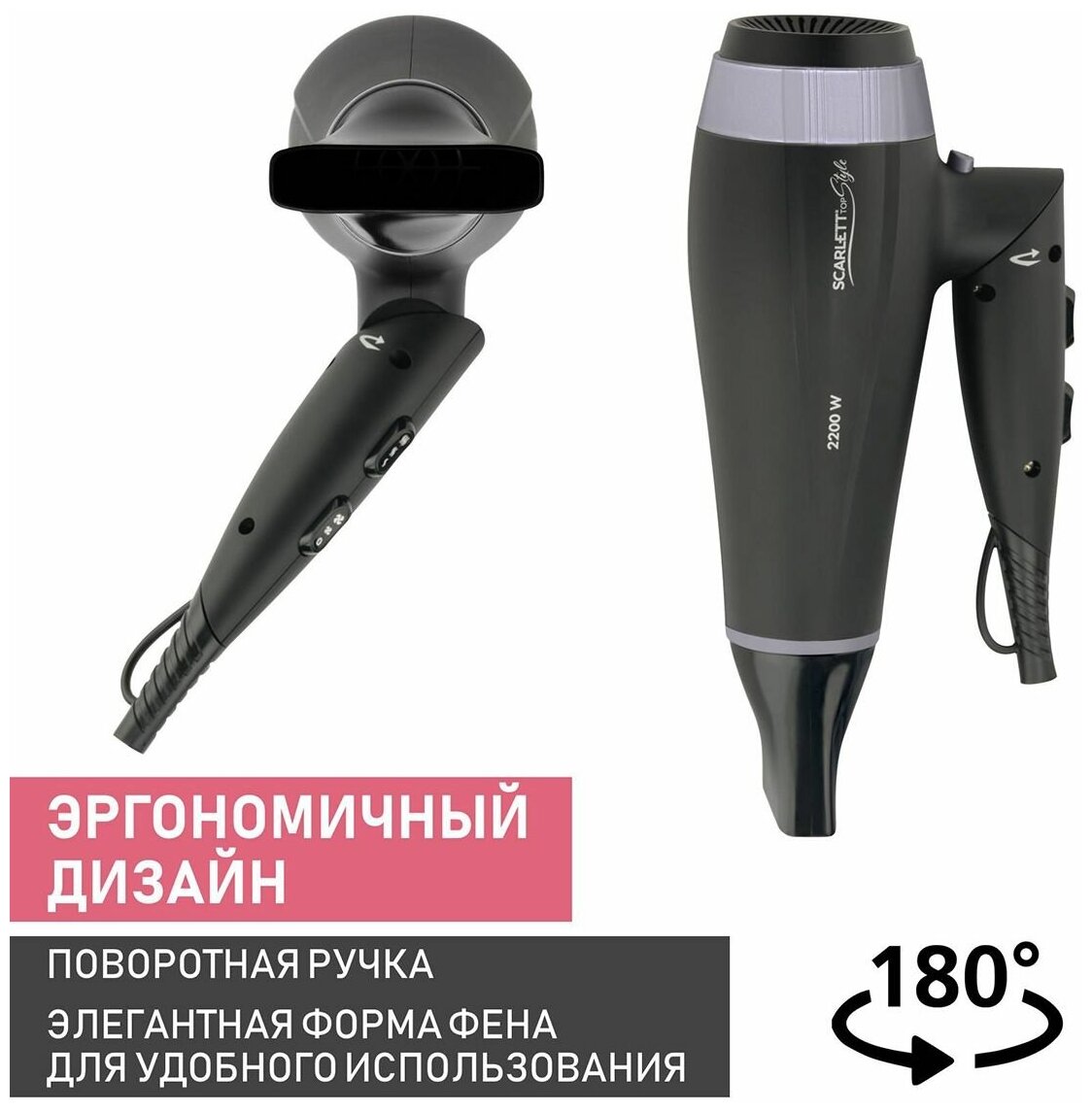 Фен - это одно из универсальных решений в линейке Scarlett Top Style. Продукт не только обладает мощным мотором 2200 Вт, но и удобен в хранении благодаря складной ручке. Он не займет много места даже в небольшой ванне или вашем чемодане, пока вы путешествуете. Он дает свободу сушить и укладывать волосы в любое время и в любом месте. Отличительной особенностью фена является профессиональная насадка-концентратор для тщательной и точной укладки. А если вы будете использовать ее вместе с кнопкой Холодного воздуха, ваша укладка продержится еще дольше. Мы позаботились о том, чтобы ваши волосы приобрели максимальный блеск и сияние, без пересушивания, благодаря технологии Advanced Tourmaline.