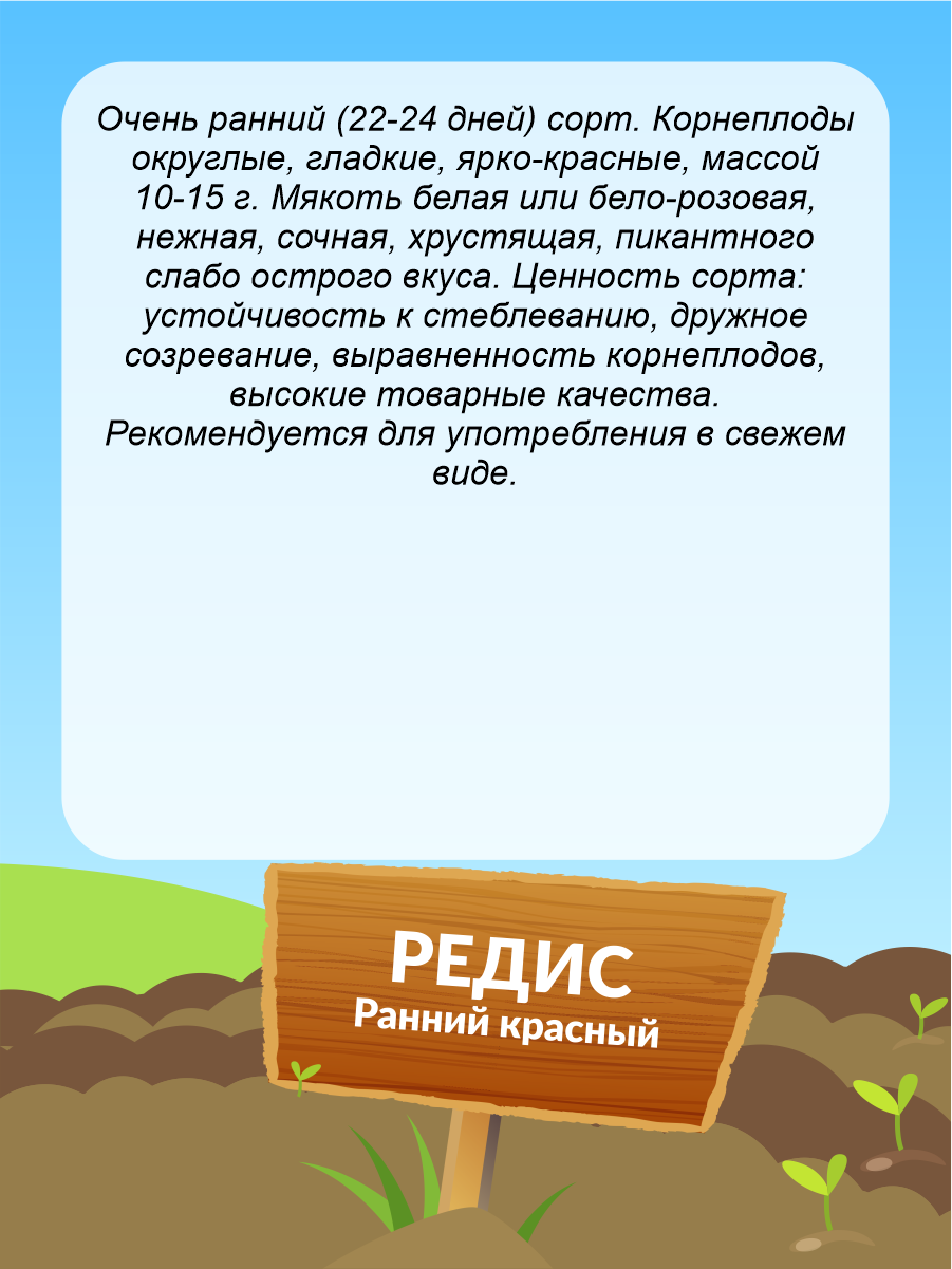 Очень ранний (22-24 дней) сорт. Корнеплоды округлые, гладкие, ярко-красные, массой 10-15 г. Мякоть белая или бело-розовая, нежная, сочная, хрустящая, пикантного слабоострого вкуса. Ценность сорта: устойчивость к стеблеванию, дружное созревание, выравненность корнеплодов, высокие товарные качества. Рекомендуется для употребления в свежем виде.