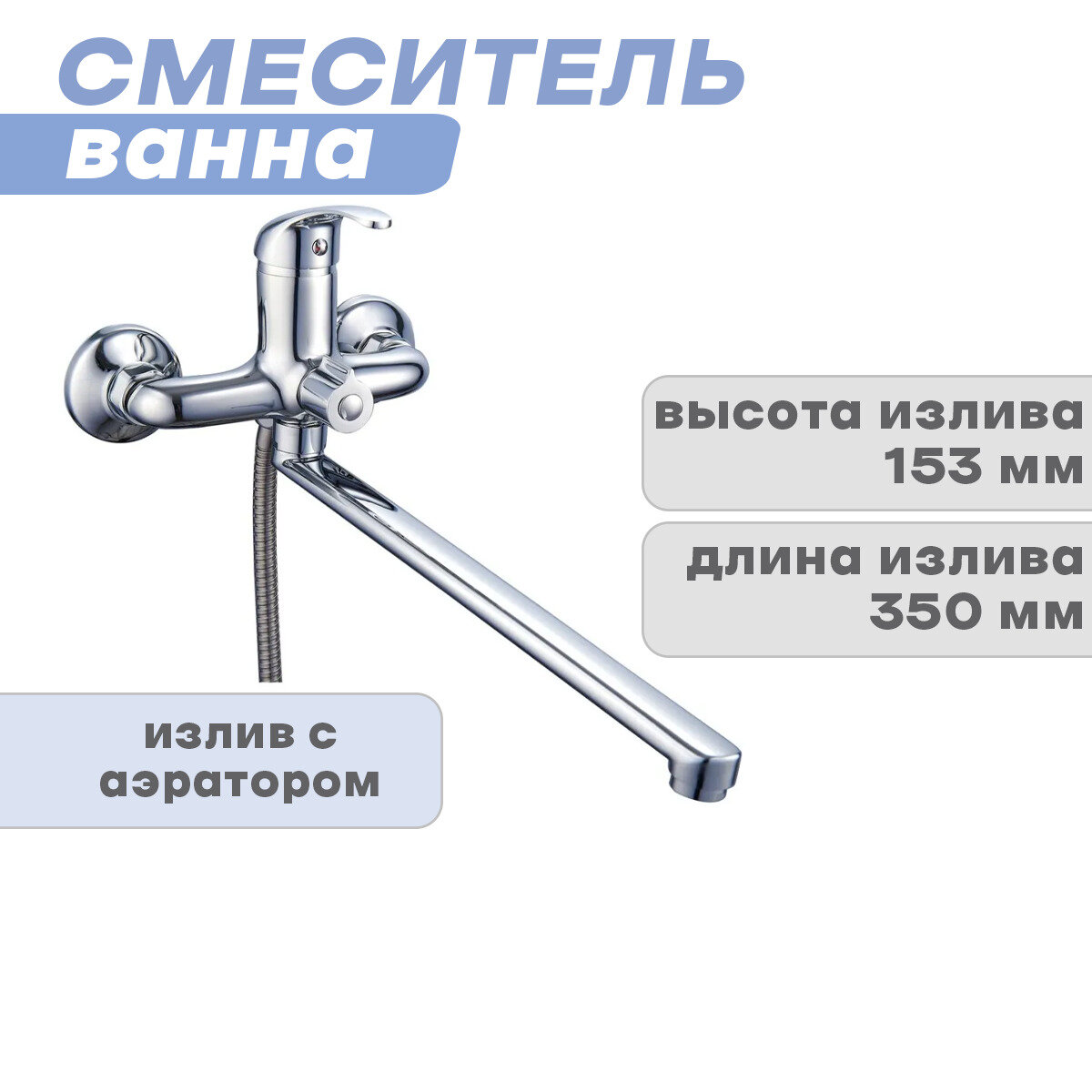 Представляет собой настенный смеситель для ванны с длинным плоским изливом, массажной лейкой в комплекте, а также центральным дивертором для душа. Имеет классическое разделение подводок для воды, характерное для настенного крепления. Используется картридж диаметра 35 мм с керамическими пластинами. Материал смесителя не подвержен коррозии. Защитное покрытие из никеля (цинка) обеспечивает дополнительную защиту, а также придает изделию красивый блеск.