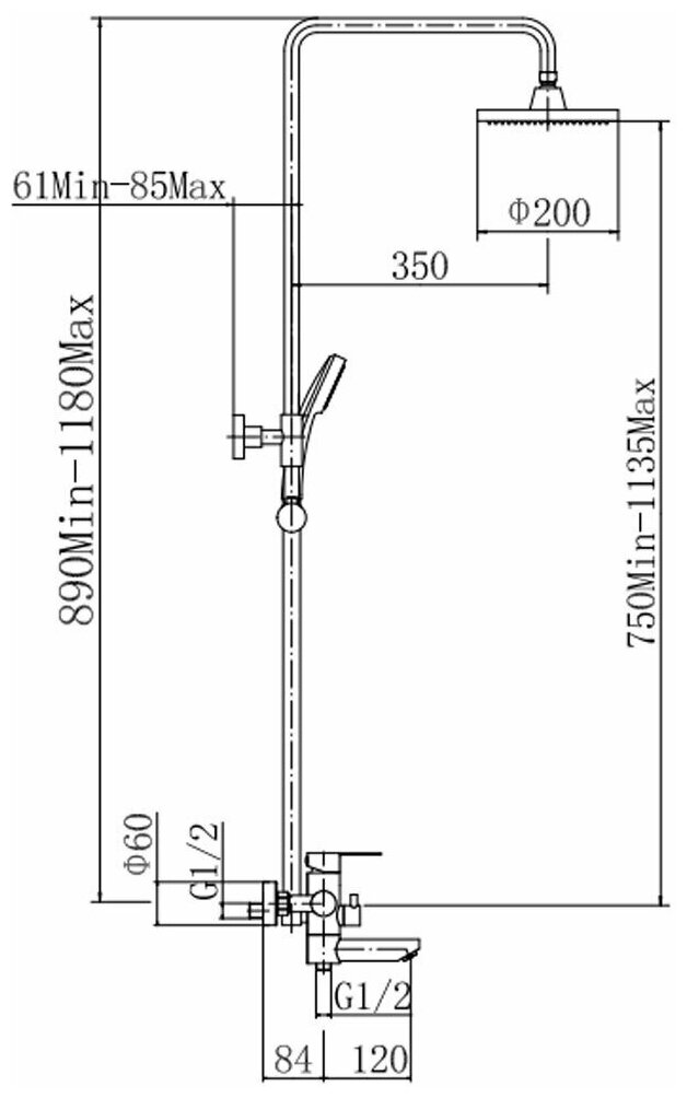 | Размер верхнего душа, мм | 200 |