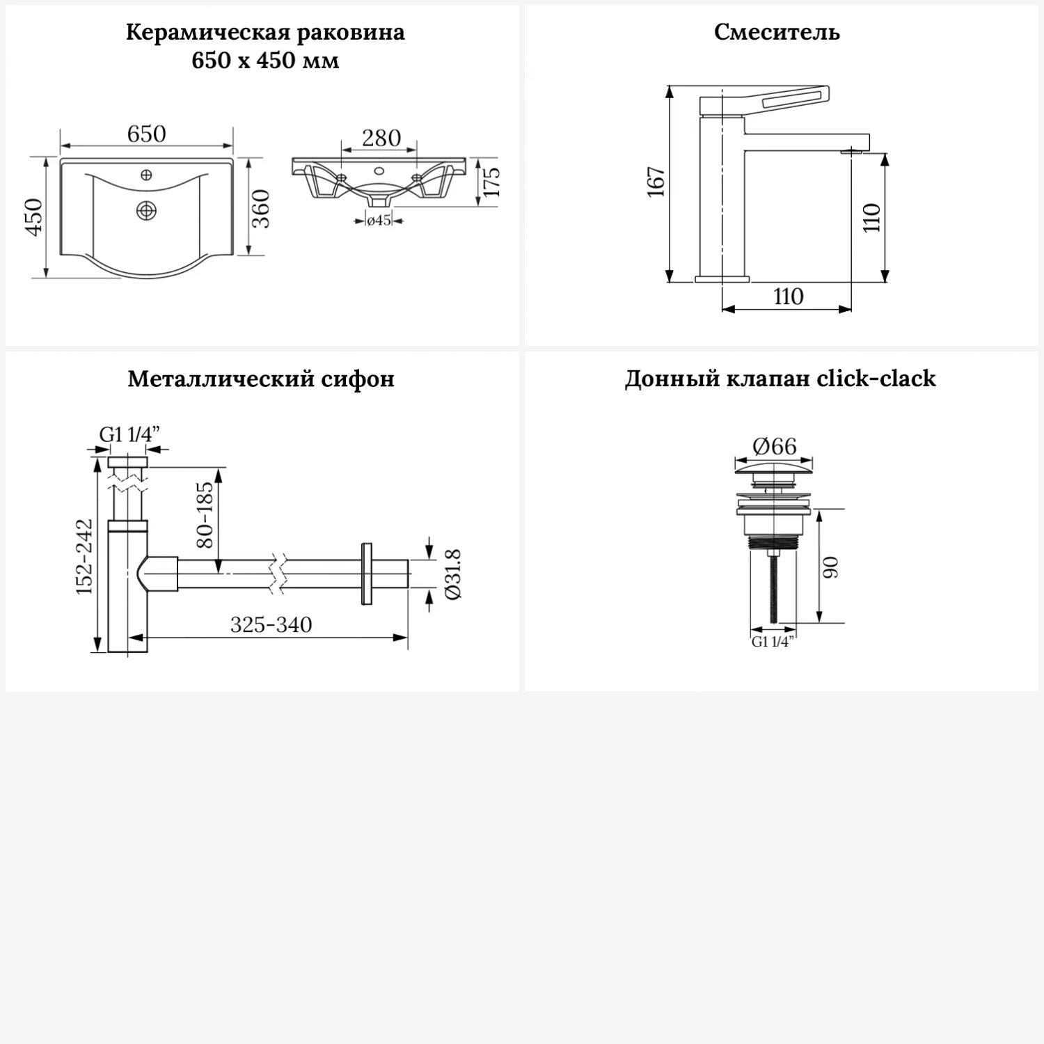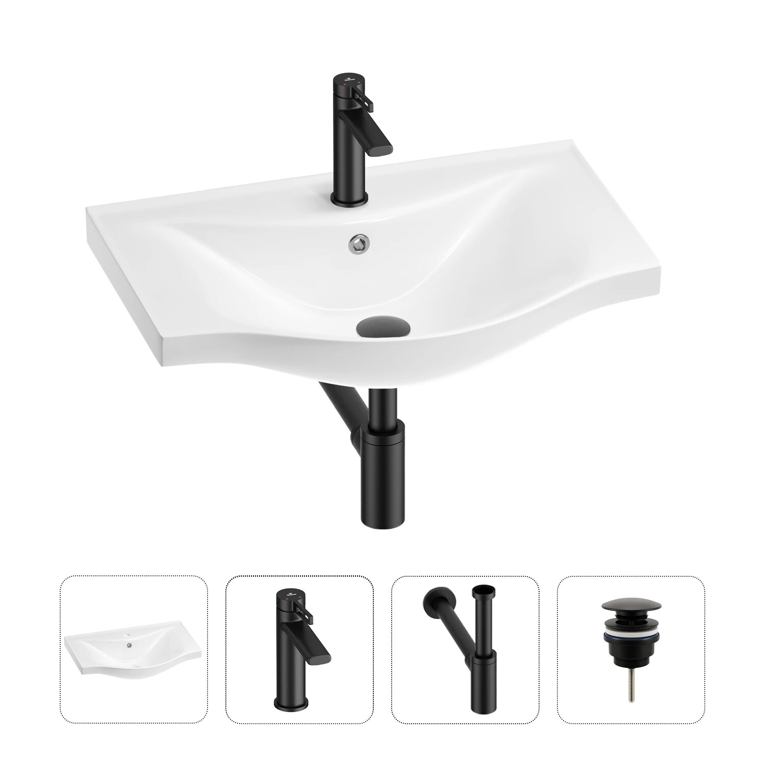 | Дополнительная информация | раковина белого глянцевого цвета, смеситель, сифон, донный клапан (цвет набора матовый черный) |