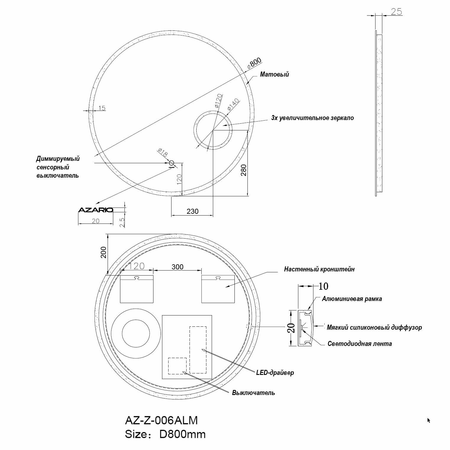 | Доп. наименование Водопад | Зеркало Azario AZ-Z-006ALM D800 сенсорный выключатель, алюминиевая рамка с увеличительным зеркалом |
