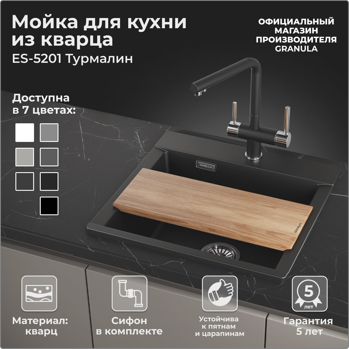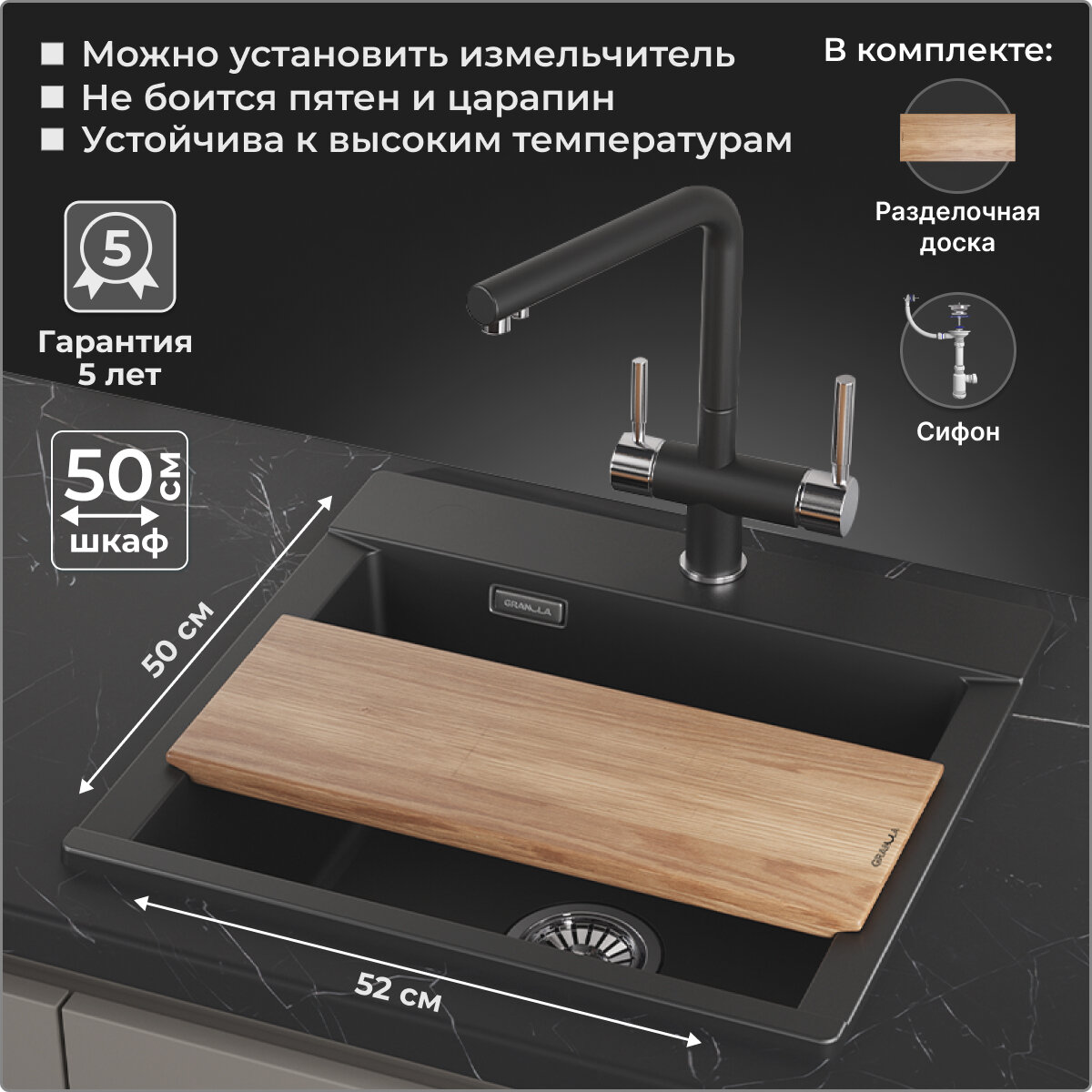 Эта стильная и практичная кухонная мойка станет незаменимым аксессуаром для вашей кухни. Благодаря своей прямоугольной форме и 7 различным цветовым вариантам, она легко впишется в любой интерьер. Изготовленная из качественного кварцевого материала, эта мойка будет служить вам долгие годы. В комплекте с мойкой идет удобная разделочная доска из ясеня и функциональный сифон с системой слива и прямоугольного перелива, который предотвратит затопление. Эта мойка идеально подходит для установки измельчителей и имеет гарантию от производителя на 5 лет. Она произведена компанией Granula и изготовлена в России.
