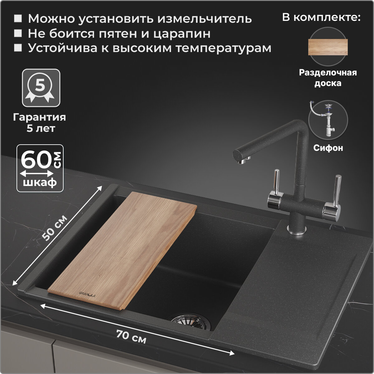 Представляем кухонную мойку Granula Estetica - идеальный баланс стиля и функциональности. В комплекте - стильная разделочная доскa из ясенa. Современный сифон предотвращает затопление. Кварцевый корпус сохранит первозданный вид. Granula гарантирует 5 лет качества. 7 цветовых вариантов. Прямоугольная форма, крыло - для удобства. Подходит для измельчителей. Идеальный выбор для вашей кухни.