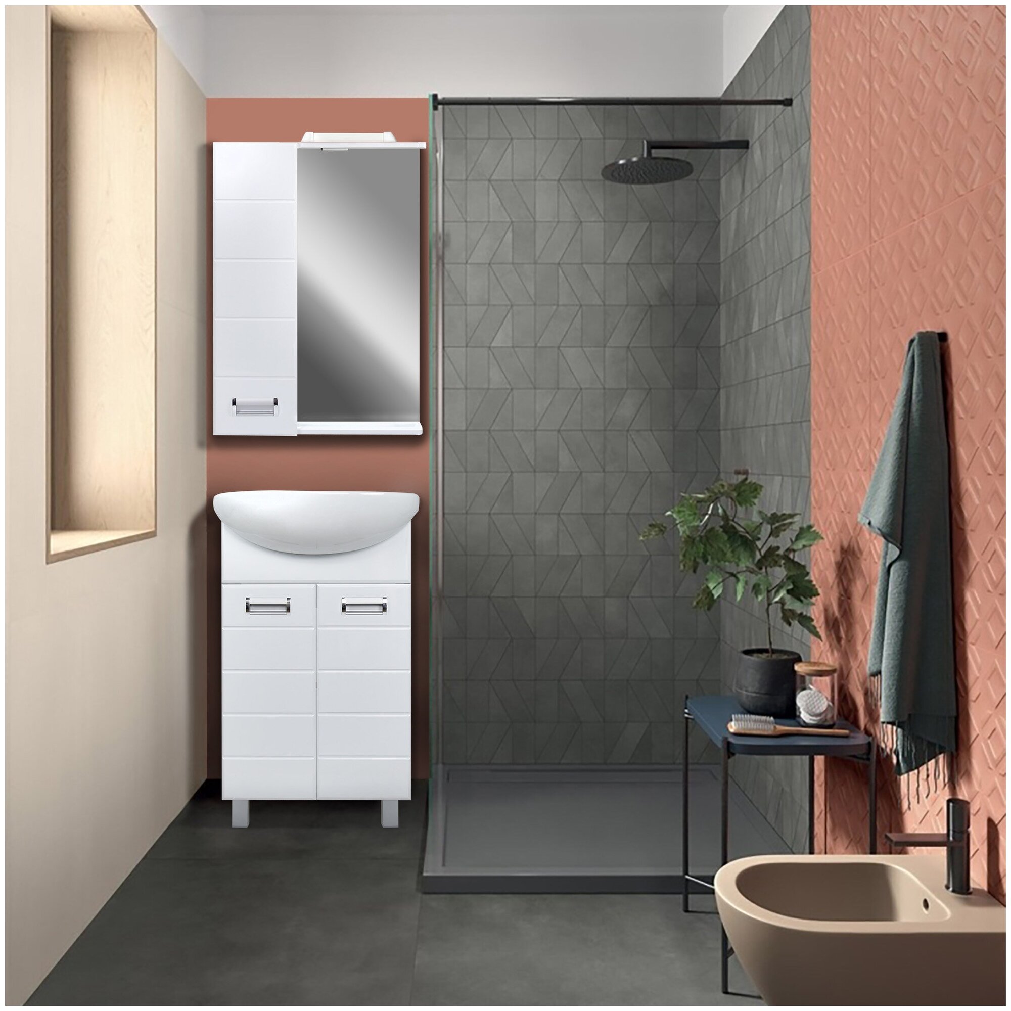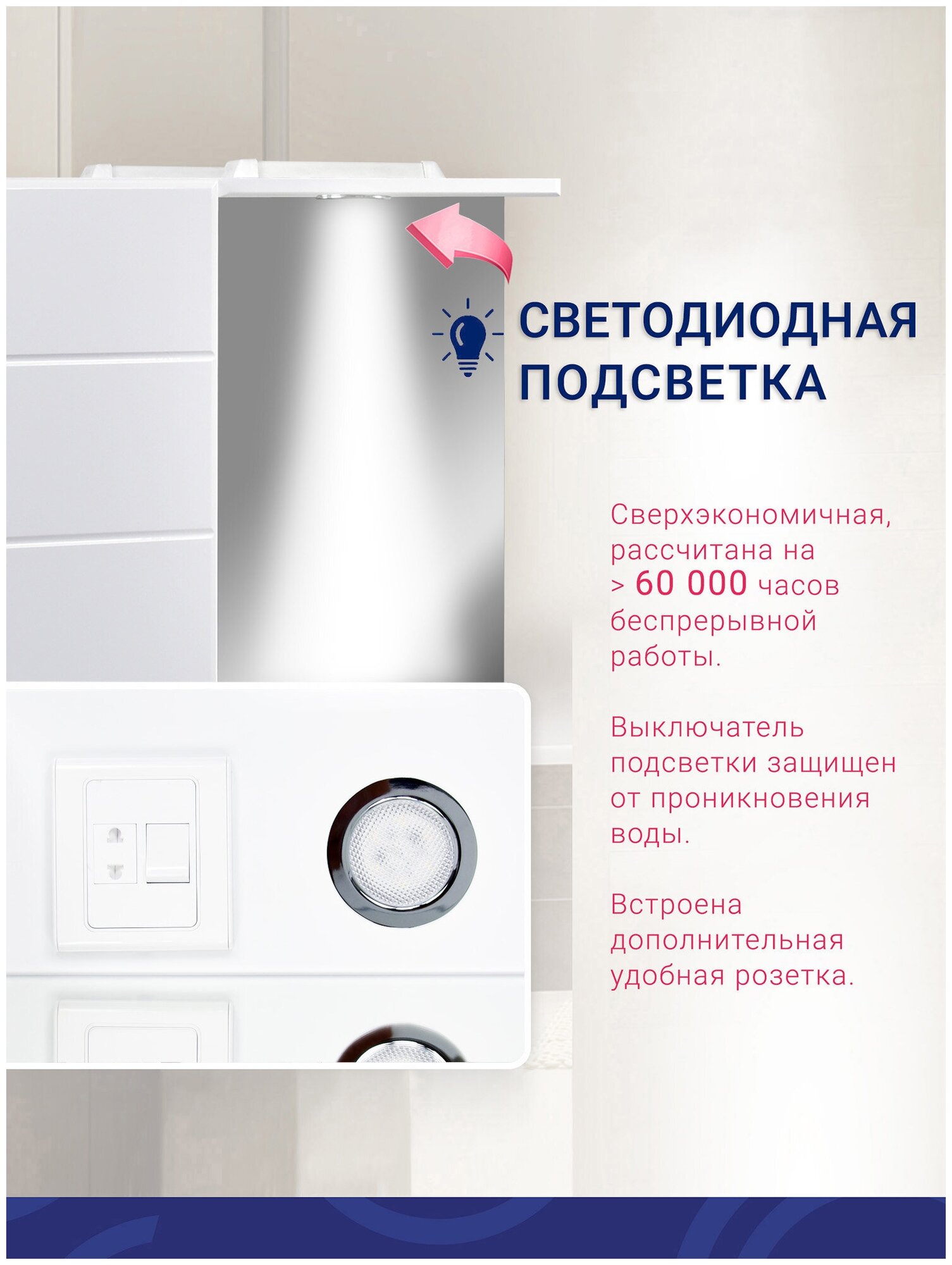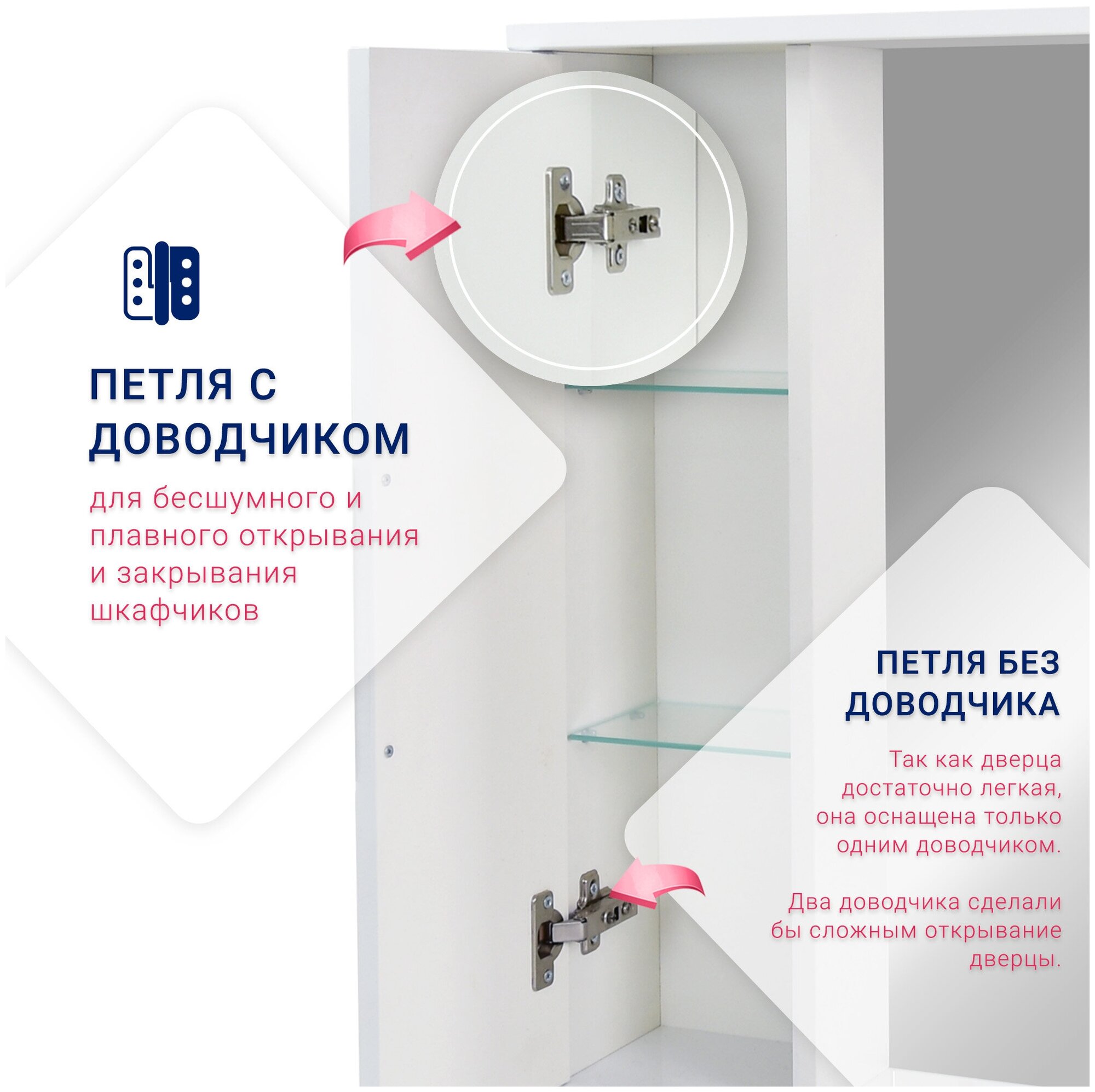 Зеркало-шкаф Вега 50 DORATIZ (Арт.: 2711.064), белый с подсветкой из коллекции Вега отличается простыми формами, имеет горизонтальную фрезеровку и оригинальные прямоугольные ручки. Каждая деталь этой мебели сочетает в себе практичность и функциональность.Фасады мебели DORATIZ изготавливаются из качественного и высокоплотного влагостойкого МДФ. Обработка зеркального полотна предназначена для использования во влажных помещениях.Шкаф оснащен двумя стеклянными полками, которые легко можно отрегулировать по высоте. Плавное закрывание дверцы обеспечивают петли с доводчиком.Сверхэкономичная система освещения рассчитана на более чем 60 000 часов беспрерывной работы. Выключатель подсветки защищен от проникновения воды. Вывод электропровода без вилки для прямого соединения с проводкой в ванной комнате.Петли с доводчиком, влагостойкое МДФ фасады, ЛДСП корпус, покрытие пленка, с LED-подсветкой.Поставляется в собранном виде и готово к установке. Вам остается только снять защитную пленку.