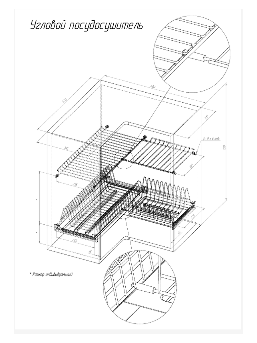 Сушилка предназначена для установки в верхний модуль 600 (внешние размеры шкафа 60*60 см), при толщине ДСП - 16 мм.
