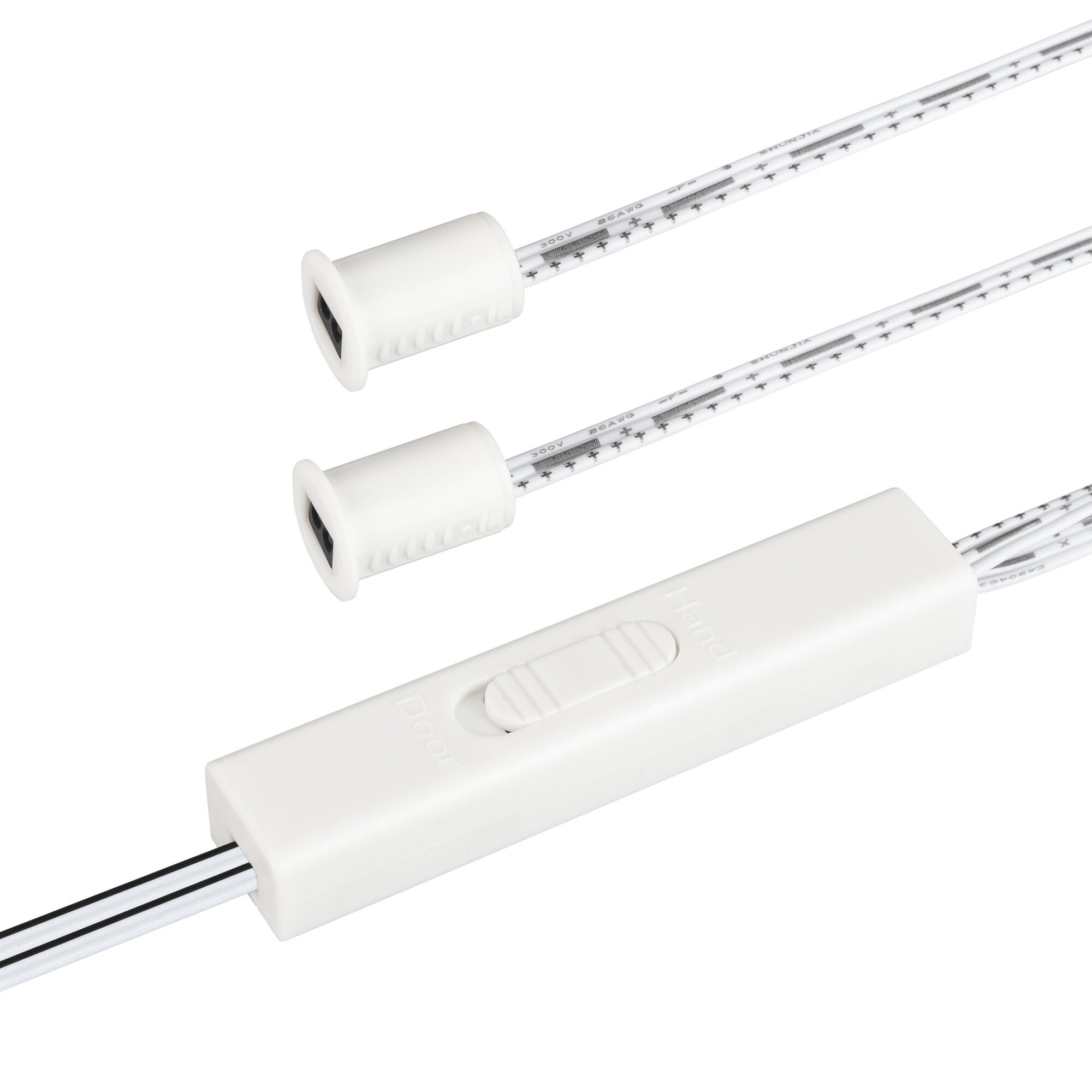 Выключатель для светодиодной ленты 12-24 В. В комплекте 2 датчика. Питание/рабочее напряжение DC 12-24 В, максимальный ток 4 A на канал, 1 канал, максимальная мощность 48-96 Вт. Реагирует на открывание дверей или движение рукой, переключатель между режимами «hand» - «door» расположен на корпусе блока управления. Расстояние срабатывания от 0.5 до 10 см, датчик открыт — «вкл», закрыт — «выкл». Габаритные размеры блока управления: 75 х 15 х 11 мм, кабель 1 м (у датчика), кабель 25 см (питание). Габаритные размеры датчика: 11 х 18 мм, врезное отверстие Ø 11 мм.