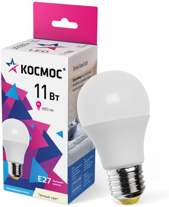 - Лампа светодиодная Космос "А60", 220V, теплый свет, цоколь Е27, 11W.