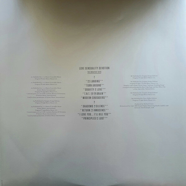 Love Sensuality Devotion: The Greatest Hits — лимитированное и ремастированное переиздание, на черном виниле, альбома-компиляции лучших композиций группы Enigma, изначально вышедшего в 2001 году. На Love Sensuality Devotion: The Greatest Hits представлены 18 оригинальных треков из всех четырёх альбомов, а также выпущенный незадолго до этого сингл «Turn Around». В оформлении нового альбома присутствуют темы и сюжеты из предыдущих альбомов. Причем над их дизайном уже традиционно работал Джоэн Замбрыски. Этот альбом был выпущен в паре с другим — на этот раз лучших ремиксов Enigma. По словам самого Крету, выход этих альбомов «означает конец первой фазы Enigma. Первый том сейчас закрыт, но я обещаю, что будет второй». Список композиций: A1 The Landing A2 Turn Around A3 Gravity Of Love A4 T.N.T. For The Brain A5 Modern Crusaders B1 Shadows In Silence B2 Return To Innocence B3 I Love You... I'll Kill You B4 Principles Of Lust C1 Sadeness C2 Silence Must Be Heard C3 Smell Of Desire C4 Mea Culpa D1 Push The Limits D2 Beyond The Invisible D3 Age Of Loneliness D4 Morphing Thru Time D5 The Cross Of Changes