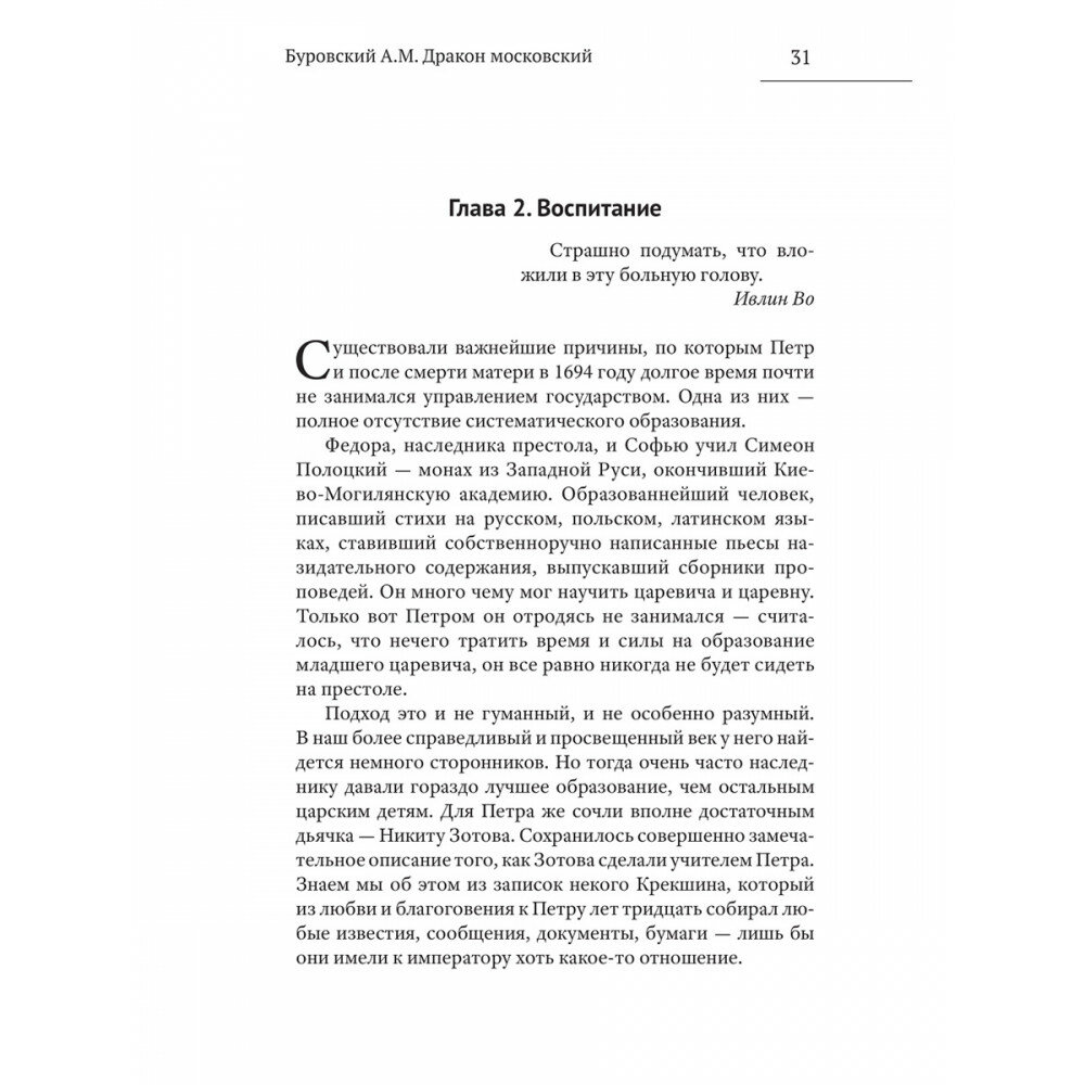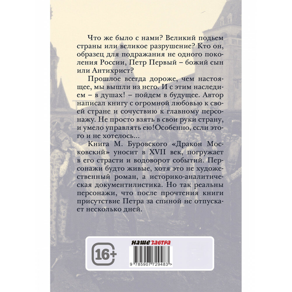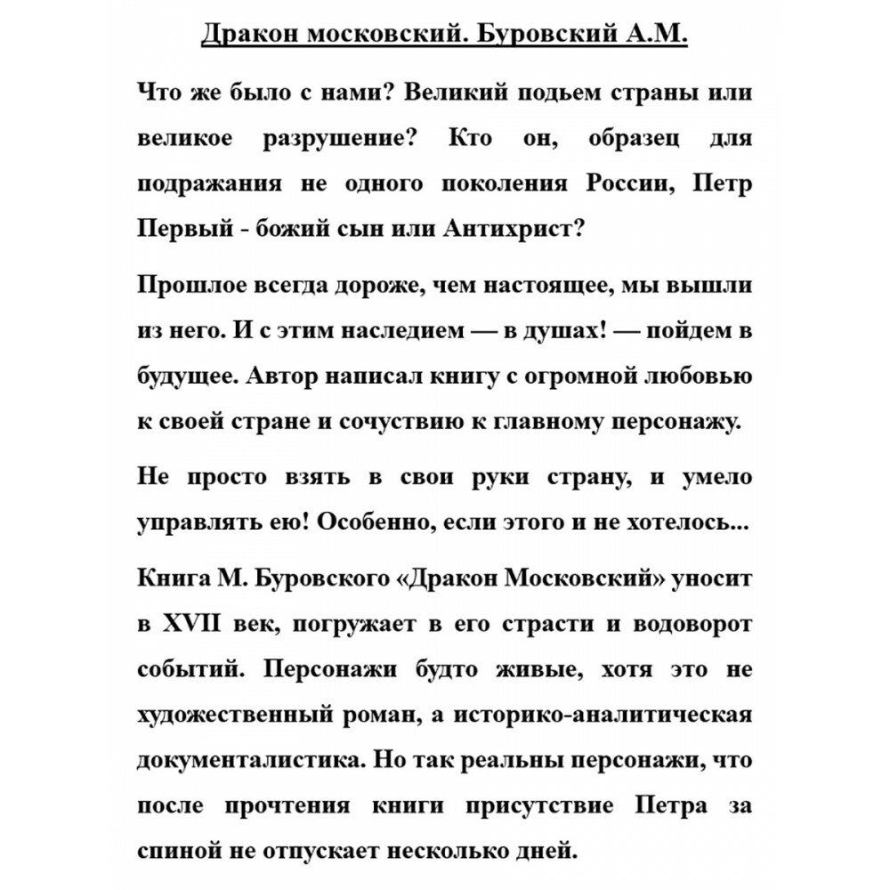 Книга М. Буровского "Дракон Московский" уносит в XVII век, погружает в его страсти и водоворот событий. Персонажи будто живые, хотя это не художественный роман, а историко-аналитическая документалистика. Но так реальны персонажи, что после прочтения книги присутствие Петра за спиной не отпускает несколько дней.