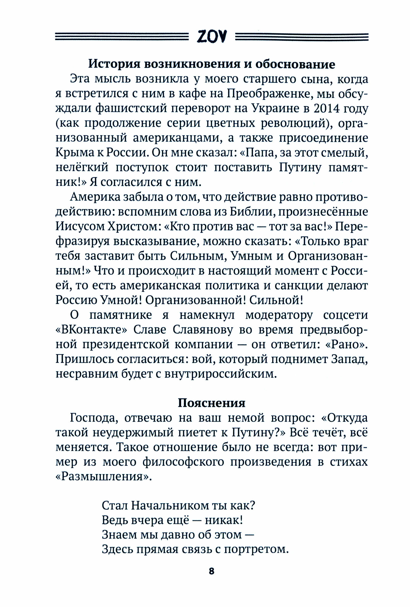В патриотический сборник «ZOV» вошли произведения современных авторов, которые по зову сердца поддерживают нашу Родину в трудное для неё время. Это стихи и проза не только о Родине, но и о людях, отстаивающих интересны своей страны, как делали это всегда наши предки.
