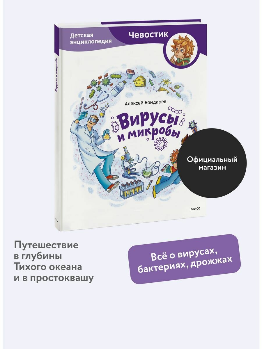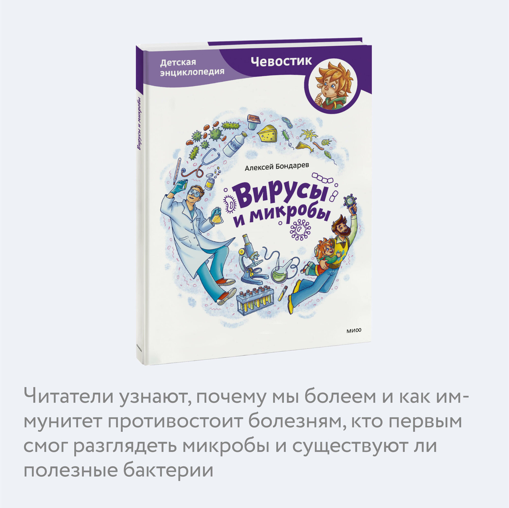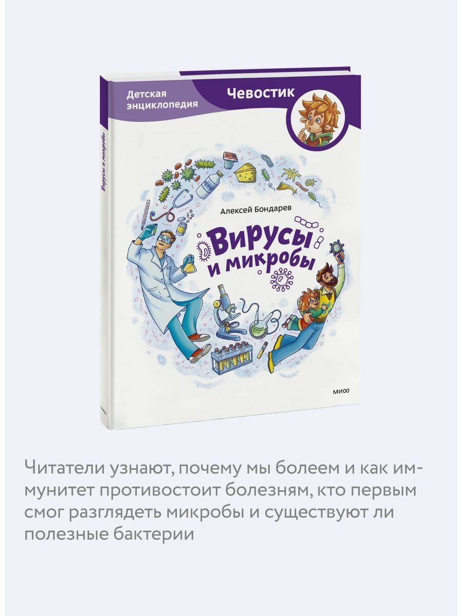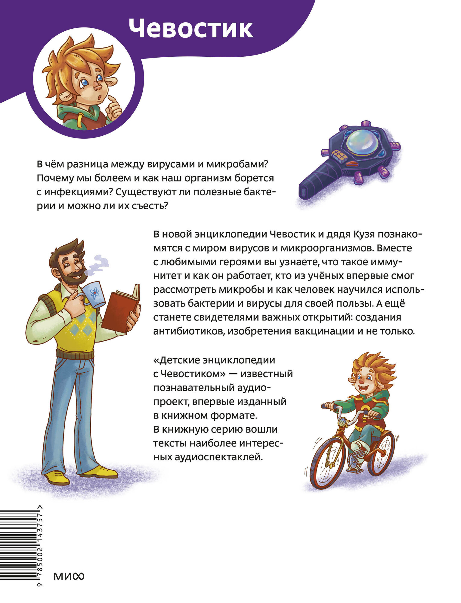 Новая книга в серии энциклопедий с Чевостиком расскажет об удивительных вирусах и микробах. В новой энциклопедии любимые герои познакомятся с миром вирусов и микроорганизмов. Вместе с Чевостиком и дядей Кузей читатели узнают, почему мы болеем и как иммунитет противостоит болезням, кто первым смог разглядеть микробы и существуют ли полезные бактерии. Герои побывают в самых неожиданных местах, понаблюдают за инфузориями и амёбами, переместятся в прошлое и встретятся с выдающимися учеными: Луи Пастером, Александром Флемингом, Антони ван Левенгуком. И даже станут свидетелями важных открытий в биологии и медицине: создания антибиотиков, изобретения вакцинации и не только. Кто такой Чевостик? Чевостик — симпатичный герой из известного аудиопроекта. Сегодня ребята знают его по энциклопедиям. В серии продолжают выходить книги, которые объясняют ребенку устройство мира. Дети гораздо лучше воспринимают информацию, когда о мире им рассказывает какой-нибудь сказочный персонаж. Именно поэтому девчонки и мальчишки так любят подобные энциклопедии. Чевостик вместе с дядей Кузей совершает удивительные путешествия в мир наук: физики, химии, астрономии, анатомии, геологии и других. Он рассказывает детям о великих географических открытиях, покорении космоса и волшебных химических превращениях. Для кого эта книга Для детей от 5 лет Для всех-всех фанатов Чевостика. Для дошкольников и младших школьников