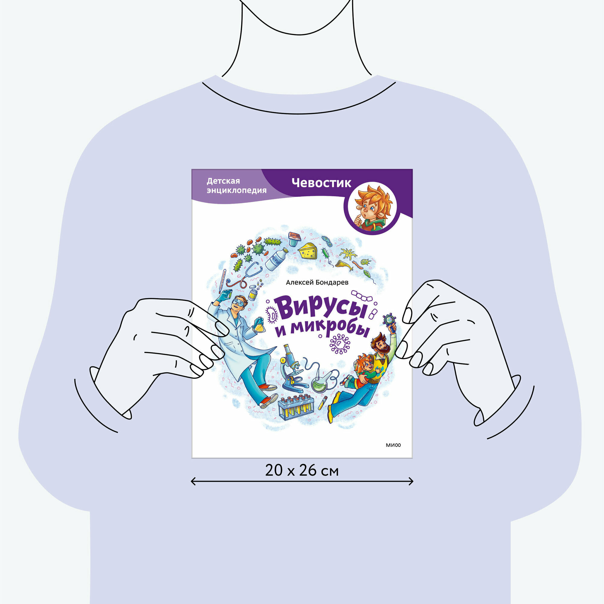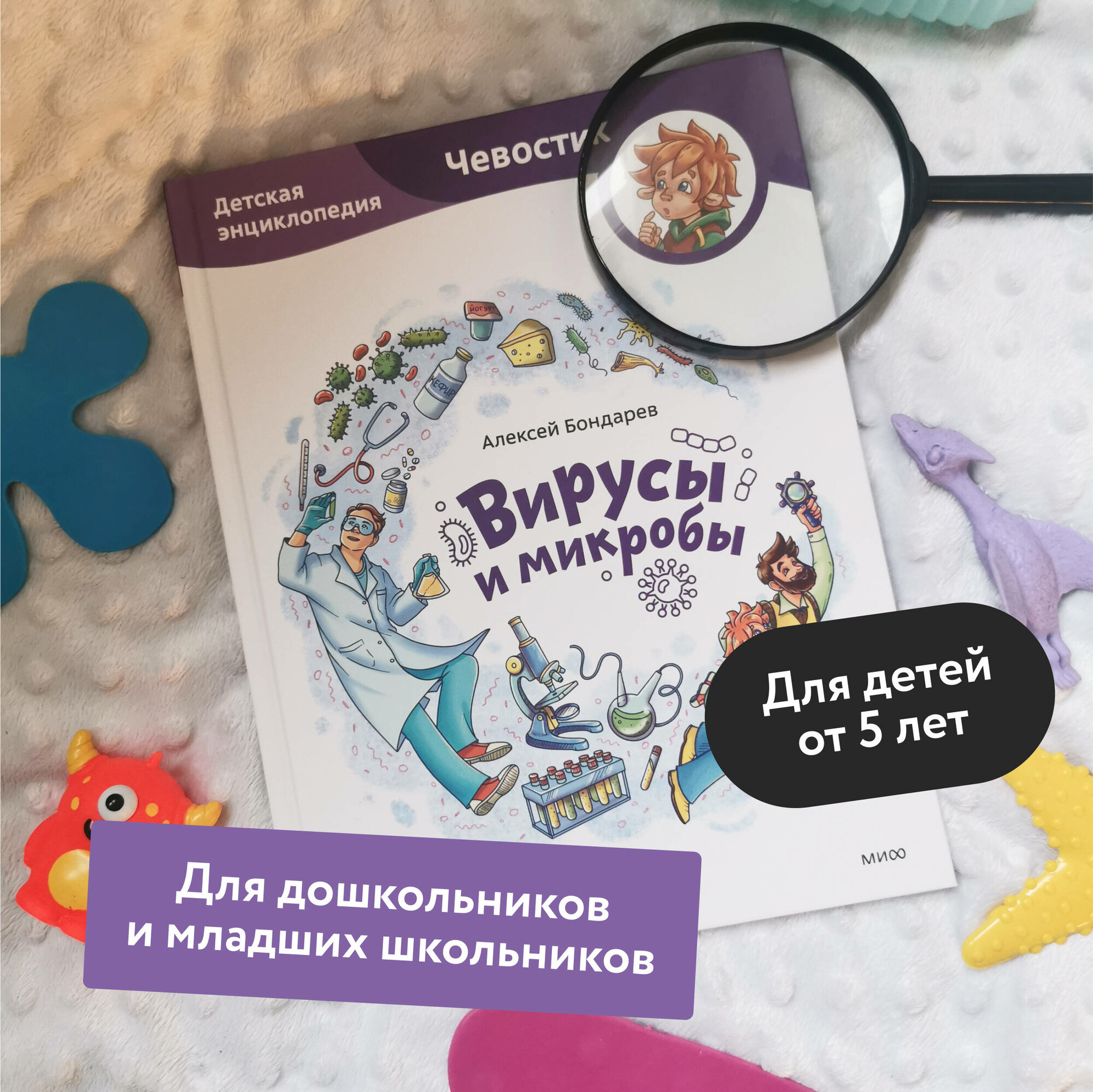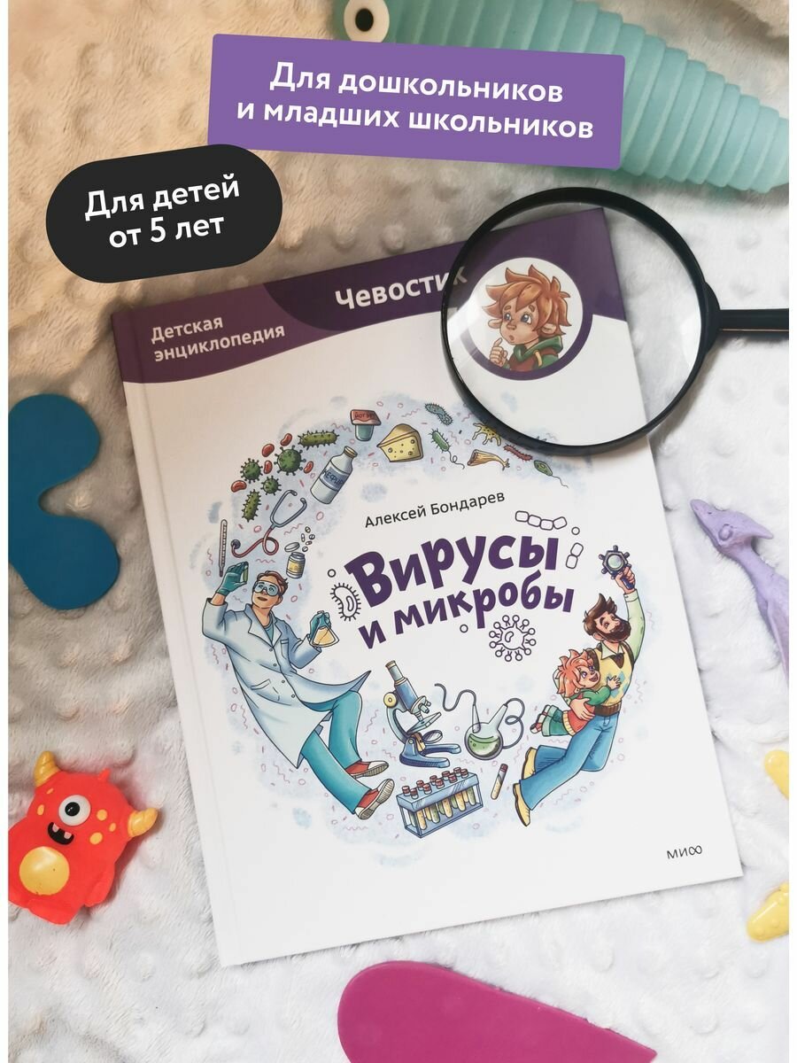 Новая книга в серии энциклопедий с Чевостиком расскажет об удивительных вирусах и микробах. В новой энциклопедии любимые герои познакомятся с миром вирусов и микроорганизмов. Вместе с Чевостиком и дядей Кузей читатели узнают, почему мы болеем и как иммунитет противостоит болезням, кто первым смог разглядеть микробы и существуют ли полезные бактерии. Герои побывают в самых неожиданных местах, понаблюдают за инфузориями и амёбами, переместятся в прошлое и встретятся с выдающимися учеными: Луи Пастером, Александром Флемингом, Антони ван Левенгуком. И даже станут свидетелями важных открытий в биологии и медицине: создания антибиотиков, изобретения вакцинации и не только. Кто такой Чевостик? Чевостик — симпатичный герой из известного аудиопроекта. Сегодня ребята знают его по энциклопедиям. В серии продолжают выходить книги, которые объясняют ребенку устройство мира. Дети гораздо лучше воспринимают информацию, когда о мире им рассказывает какой-нибудь сказочный персонаж. Именно поэтому девчонки и мальчишки так любят подобные энциклопедии. Чевостик вместе с дядей Кузей совершает удивительные путешествия в мир наук: физики, химии, астрономии, анатомии, геологии и других. Он рассказывает детям о великих географических открытиях, покорении космоса и волшебных химических превращениях. Для кого эта книга Для детей от 5 лет Для всех-всех фанатов Чевостика. Для дошкольников и младших школьников
