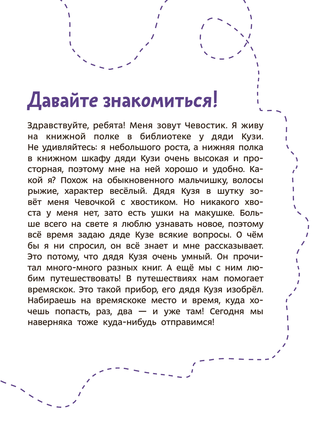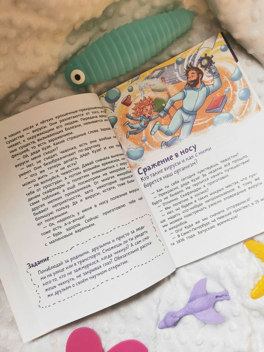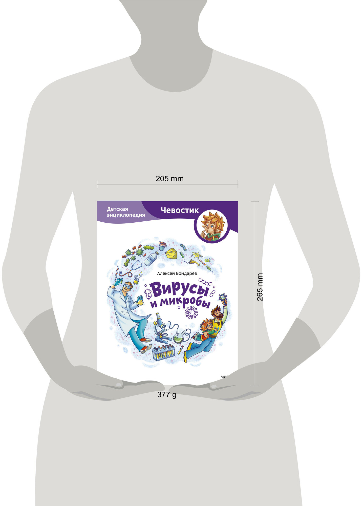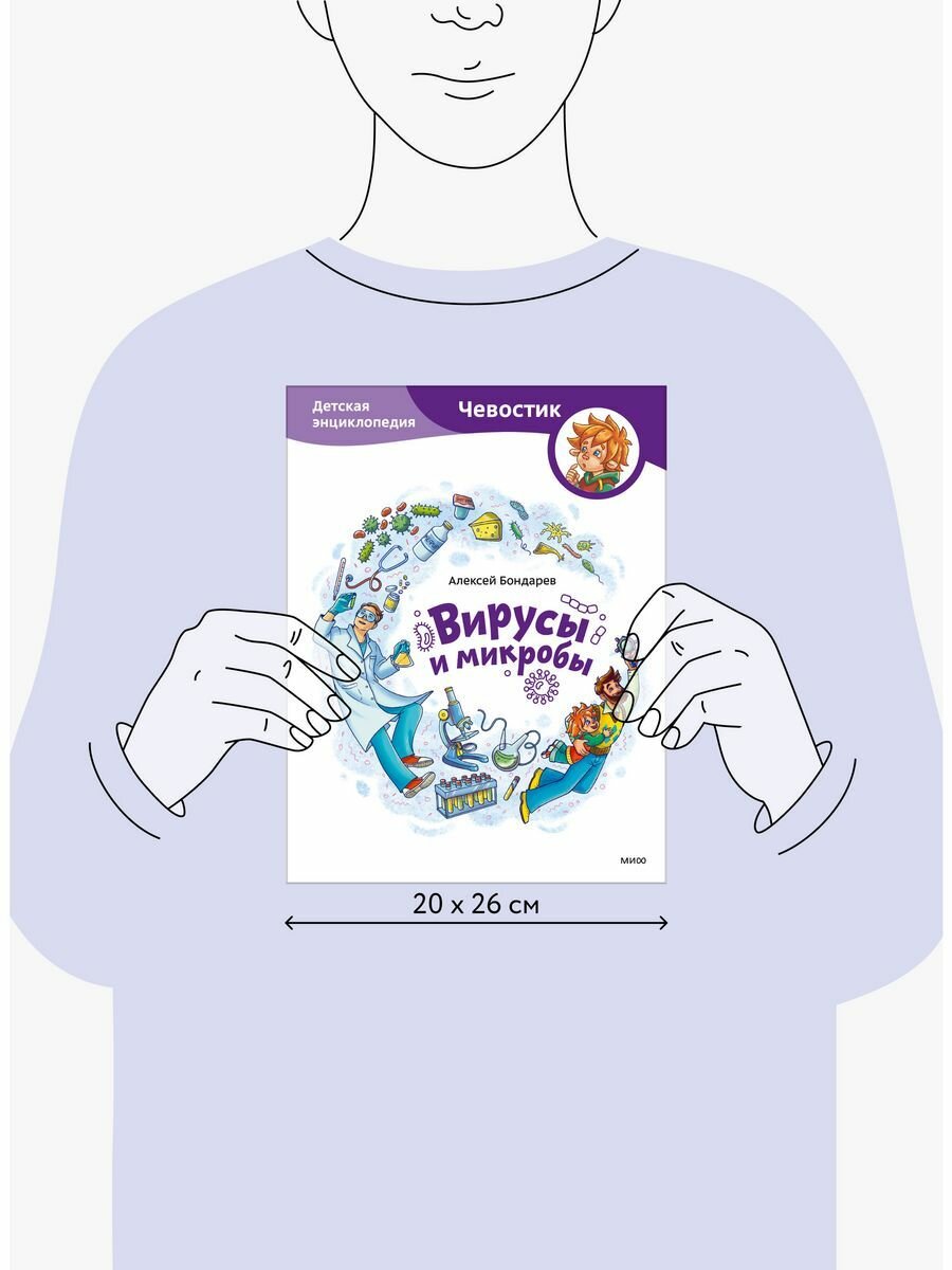 Новая книга в серии энциклопедий с Чевостиком расскажет об удивительных вирусах и микробах. В новой энциклопедии любимые герои познакомятся с миром вирусов и микроорганизмов. Вместе с Чевостиком и дядей Кузей читатели узнают, почему мы болеем и как иммунитет противостоит болезням, кто первым смог разглядеть микробы и существуют ли полезные бактерии. Герои побывают в самых неожиданных местах, понаблюдают за инфузориями и амёбами, переместятся в прошлое и встретятся с выдающимися учеными: Луи Пастером, Александром Флемингом, Антони ван Левенгуком. И даже станут свидетелями важных открытий в биологии и медицине: создания антибиотиков, изобретения вакцинации и не только. Кто такой Чевостик? Чевостик — симпатичный герой из известного аудиопроекта. Сегодня ребята знают его по энциклопедиям. В серии продолжают выходить книги, которые объясняют ребенку устройство мира. Дети гораздо лучше воспринимают информацию, когда о мире им рассказывает какой-нибудь сказочный персонаж. Именно поэтому девчонки и мальчишки так любят подобные энциклопедии. Чевостик вместе с дядей Кузей совершает удивительные путешествия в мир наук: физики, химии, астрономии, анатомии, геологии и других. Он рассказывает детям о великих географических открытиях, покорении космоса и волшебных химических превращениях. Для кого эта книга Для детей от 5 лет Для всех-всех фанатов Чевостика. Для дошкольников и младших школьников
