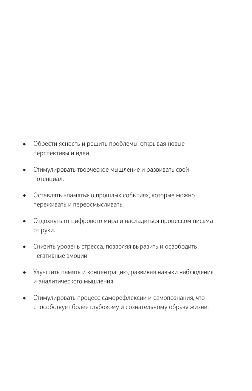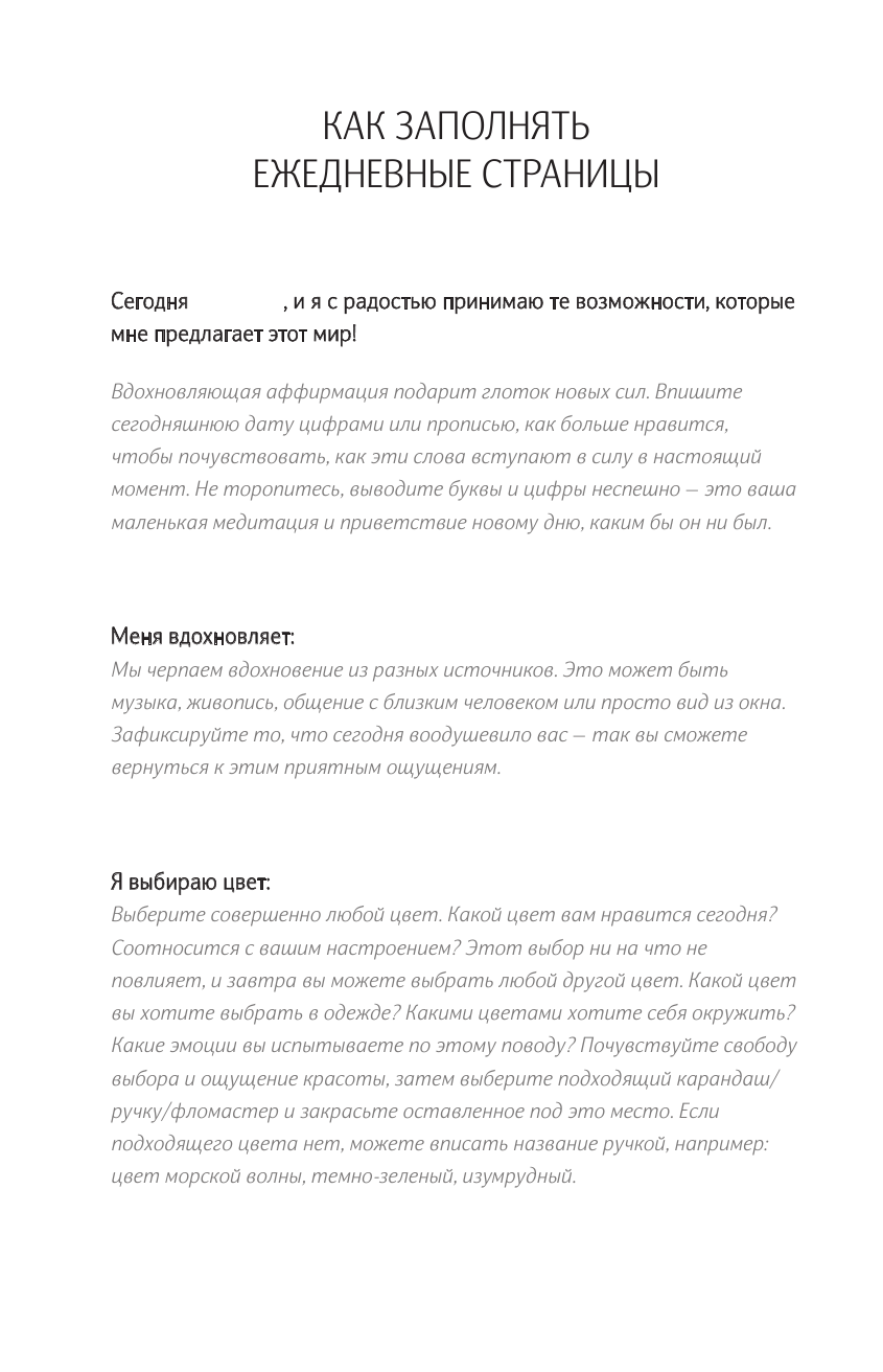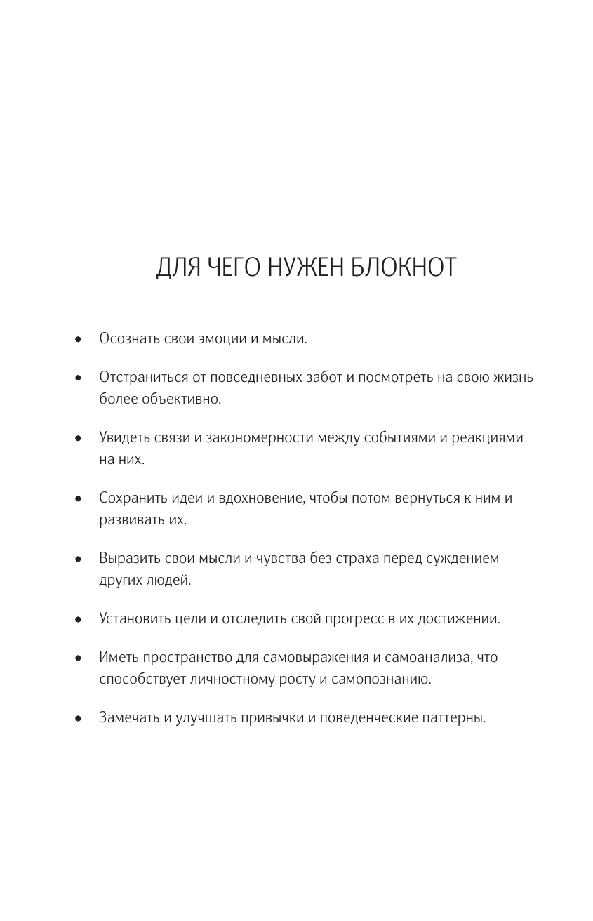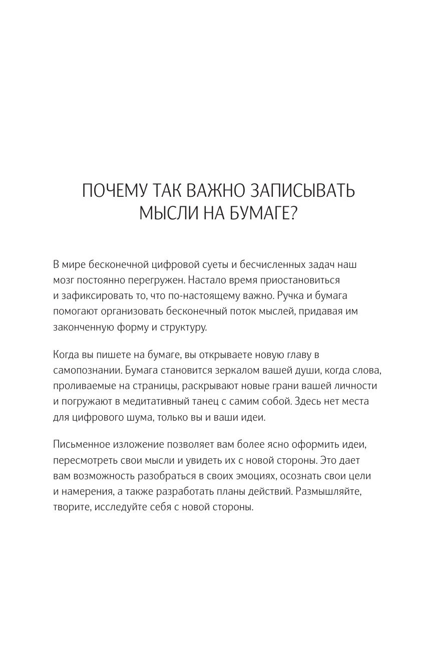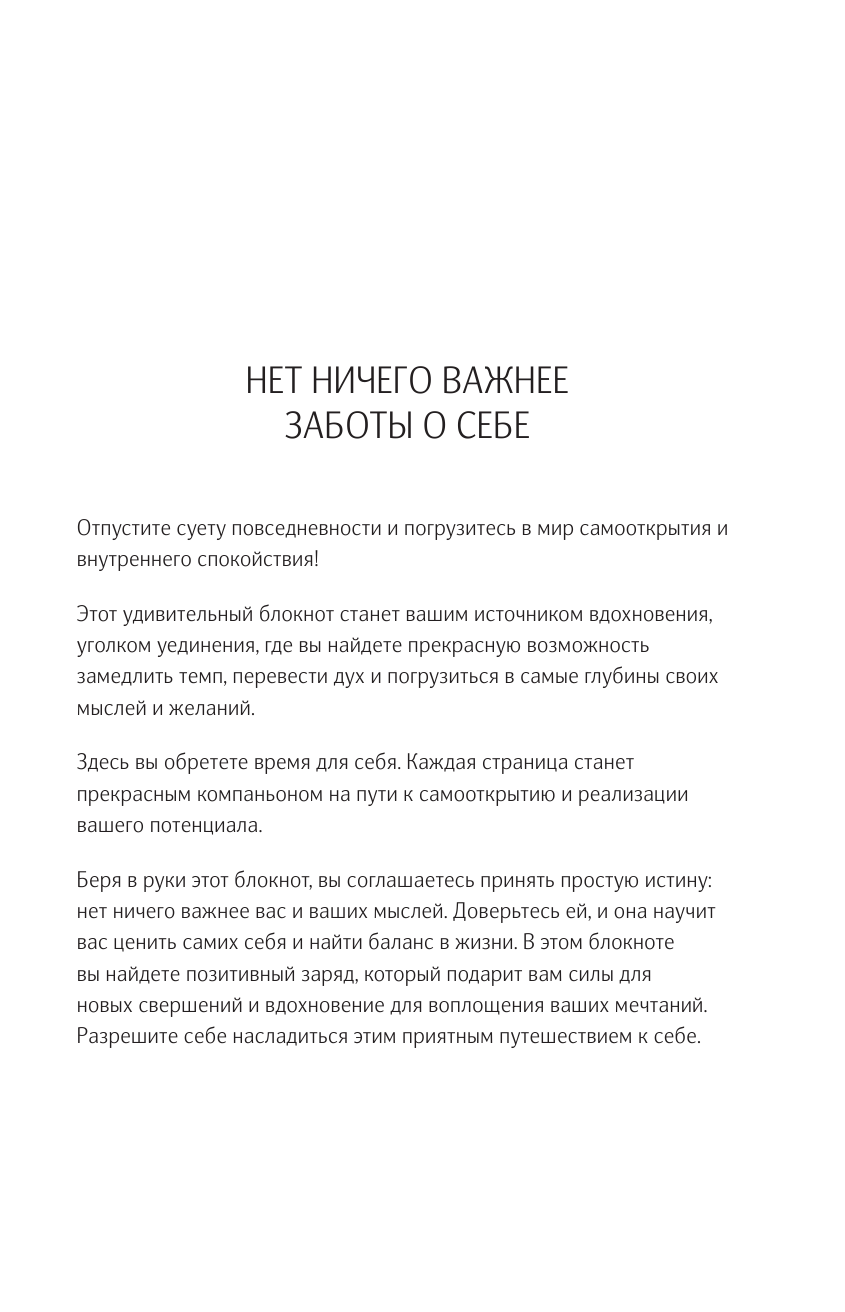 Этот удивительный блокнот станет вашим источником вдохновения, уголком уединения, где вы найдете прекрасную возможность замедлить темп, перевести дух и погрузиться в самые глубины своих мыслей и желаний.