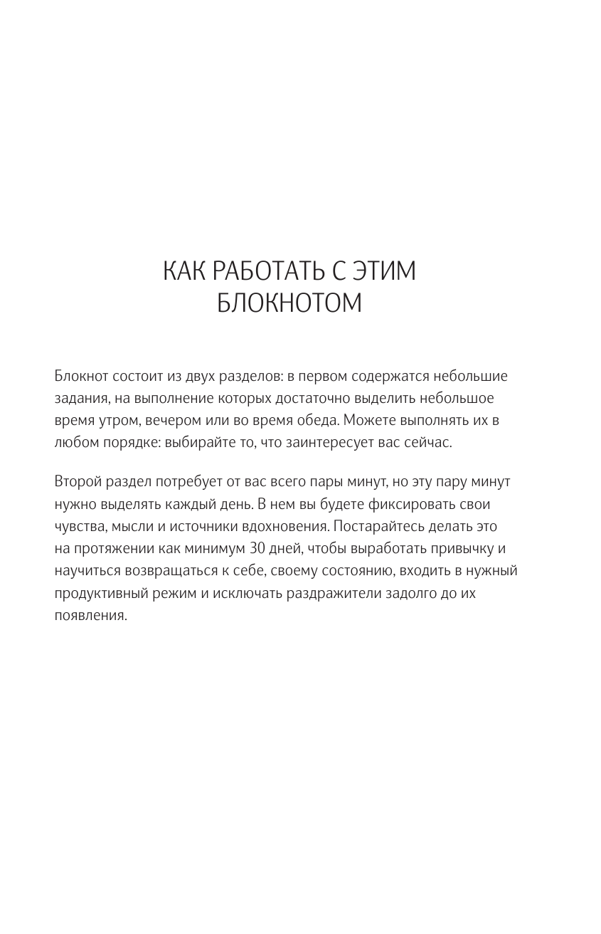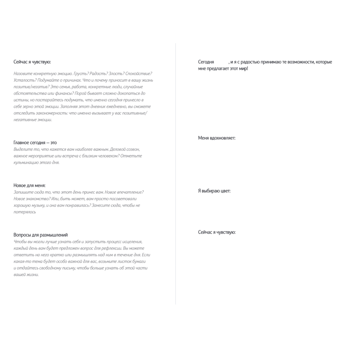 Блокнот содержит два раздела: один с заданиями на проработку разных жизненных сфер, который поможет вам проанализировать то, что сейчас есть в вашей жизни, и с помощью вопросов, заданий и творчества наметить планы развития; второй раздел — с ежедневными вопросами о самом важном, который создан для ежедневной рефлексии; он поможет отслеживать состояние в динамике и выводить в осознанность вопросы того, как вы себя ощущаете и что для вас важно каждый день. Бонус: каждый день есть вопрос для размышления, который поможет заново познакомиться с собой, своими ценностями, задачами и открыть себя заново!