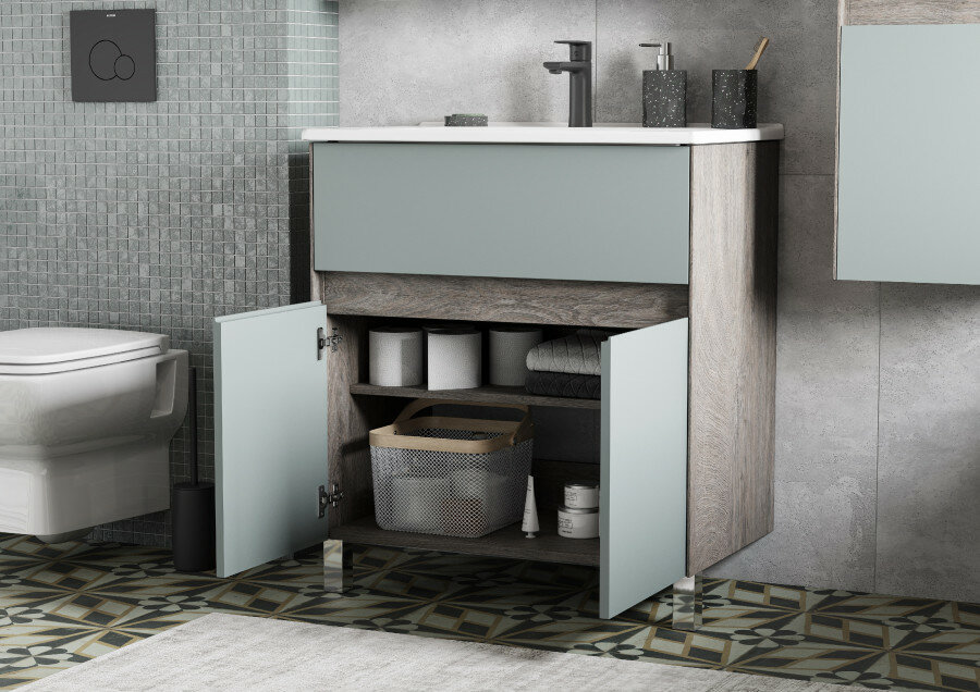 Коллекция мебели Форест вдохновлена природными мотивами и выполнена в естественных оттенках. Минималистичный сдержанный дизайн позволяет органично вписать ее в большинство современных интерьеров. В тумбе максимально удобная эргономика: функциональный ящик и вместительно пространство за фасадами-створками. В ящике организована система хранения для удобного и комфортного использования: две регулируемые планки. Верхняя часть фасада-створки обработана под ручку L-профиль, за створками скрываются две полочки, одна из которых регулируемая, а также немного утоплена внутрь для комфортного хранения высоких предметов. Тумбы коллекции Форест могут устанавливаться как на опоры, так и в подвесном варианте: в комплект входят две регулируемые опоры.