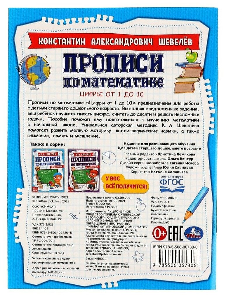 Прописи по математике с заданиями «К. А. Шевелёв. Цифры от 1 до 10» ТМ «УМка» станет отличным помощником для родителей в развитии ребёнка:- соответствует ФГОС- подготовка к школе- тренируем счёт до 10- решаем простые примеры- удобный форматНа страницах этих прописей дошкольника ожидают занимательные упражнения по авторской методике К. А. Шевелёва, которые помогут ему закрепить знания о цифрах от 1 до 10 и научиться решать с ними несложные задачки. Благодаря компактному размеру прописи можно брать даже с собой в поездки, чтобы с пользой скоротать время в дороге.Игровые занятия с раскраской-прописями ТМ «УМка» помогают подготовить руку к письму и способствуют развитию:- мелкой моторики рук- памяти- внимания- усидчивостиОбъём: 16 стр. Формат: 145 х 195 мм.Материал: офсетная бумага.Рекомендовано детям от 5-ти лет.