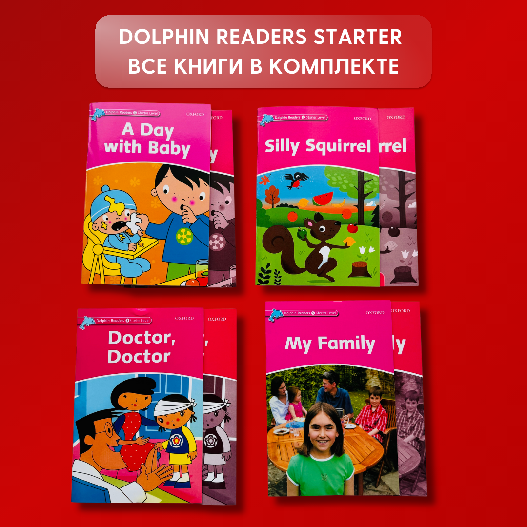 Комплект состоит из Dolphin Readers Starter 4 наборов:- A day with baby,- Doctor, Doctor,- Silly squirrel,- My familyВ комплектацию серии входят сами книги и рабочие тетради. Адаптированные книги для чтения серии Dolphin Readers с художественными и познавательными текстами расскажут детям о мире вокруг них. Рассказы и межпредметные тексты с цветными иллюстрациями заинтересуют детей и превратят изучение английского языка в увлекательное занятие. Комплексные задания присутствуют на центральном развороте. В каждой книге - заметки для учителей и родителей. Серия предназначена для учащихся только начинающих изучать язык. Ключевые особенности:- Интересные темы, связанные с другими темами из учебного плана.- Иллюстрации включают полноцветные изображения и фотографии.- Каждый ридер содержит практический словарь изображений. Данный комплект будет идеальным дополнением к основному курсу и поможет запомнить ребенку новую лексику играючи.