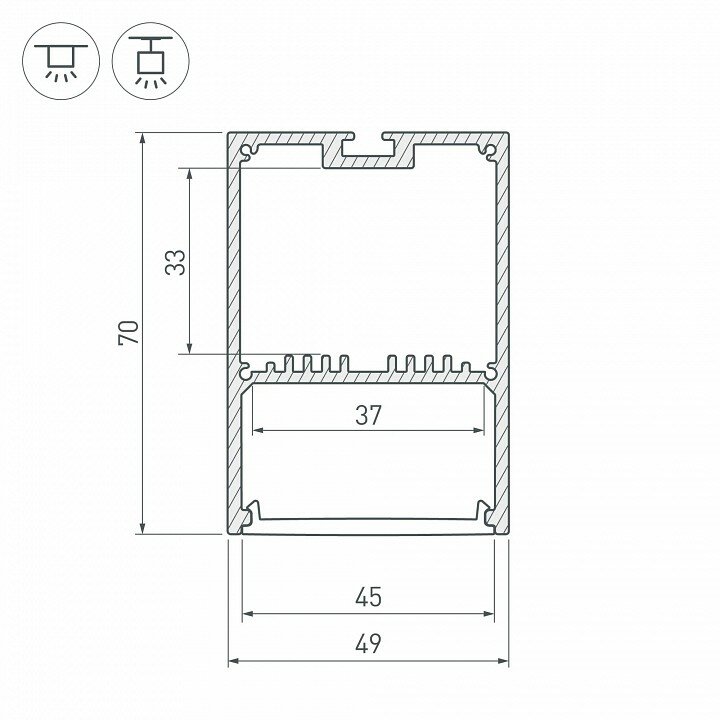 Алюминиевый светотехнический профиль специально предназначен для установки светодиодных лент или линеек. Цвет серебристый. Длина 2500 мм, сечение 49х70 мм. Профиль применяется для создания основного освещения в интерьерах. Монтаж осуществляется накладным либо подвесным способом. Предлагаются дополнительные аксессуары (экраны, заглушки и т.д.), позволяющие создать готовый светильник.