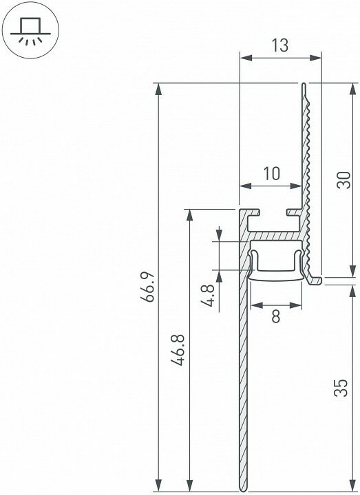 Алюминиевый профиль для светодиодных лент и линеек. Цвет - белый RAL9003 (порошковая окраска). Габаритные размеры (L×W×H): 2000x13x66,9 мм. Ширина площадки для ленты 8 мм. Аксессуары приобретаются отдельно. Цена за метр.