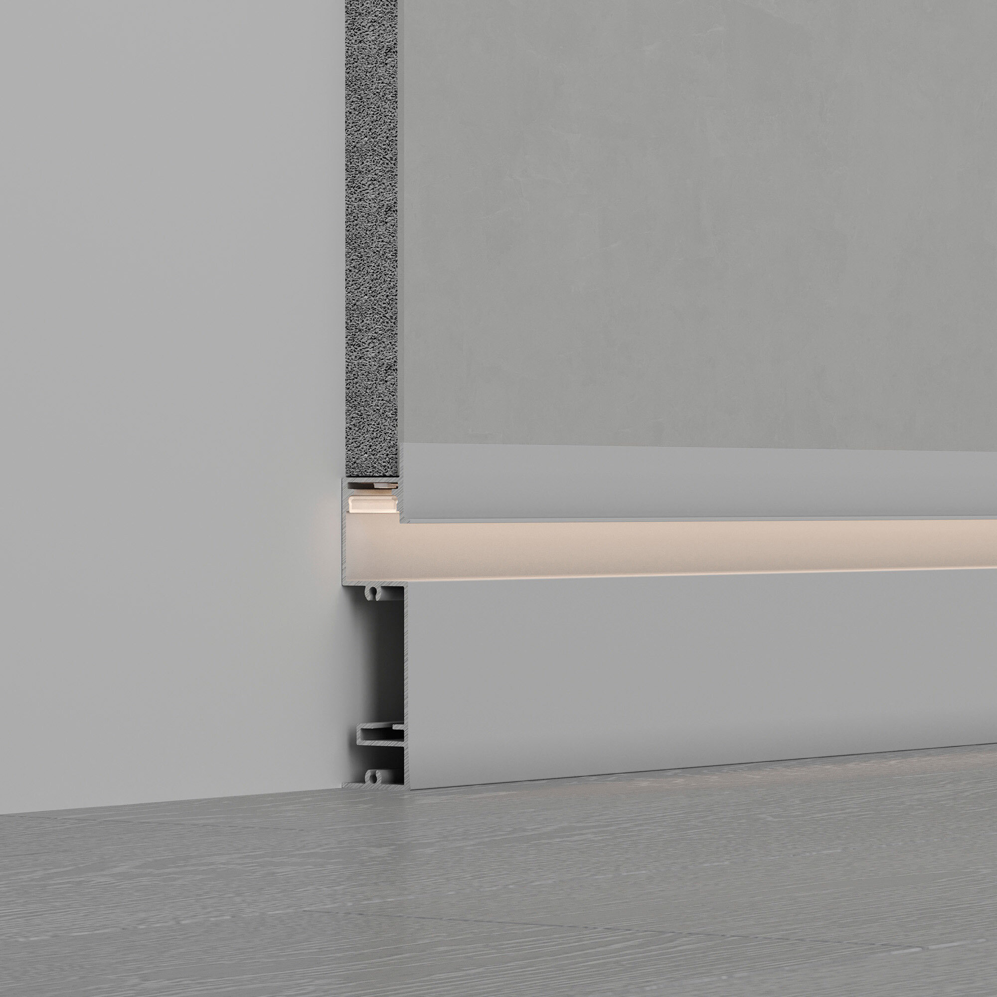 Встраиваемый алюминиевый профиль-плинтус с накладным фланцем белого цвета для создания эффекта парящей стены. Габаритные размеры этого профиля составляют 2000 мм в длину, 17,6 мм в ширину и 72,1 мм в высоту. Площадка для установки светодиодных лент позволяет использовать ленту шириной до 12 мм и мощностью до 32 Вт/м. Это обеспечивает гибкость в выборе светодиодных лент и создает потрясающие световые решения.