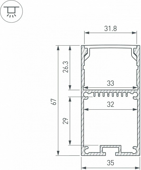 Алюминиевый профиль для светодиодных лент и линеек. Цвет - чёрный RAL9005 (порошковая окраска). Габаритные размеры (L×W×H): 2000x35x67 мм. Ширина площадки для ленты 33 мм. Отсек для БП 32х29мм. Экраны, заглушки и другие аксессуары приобретаются отдельно. Цена за 1 метр.