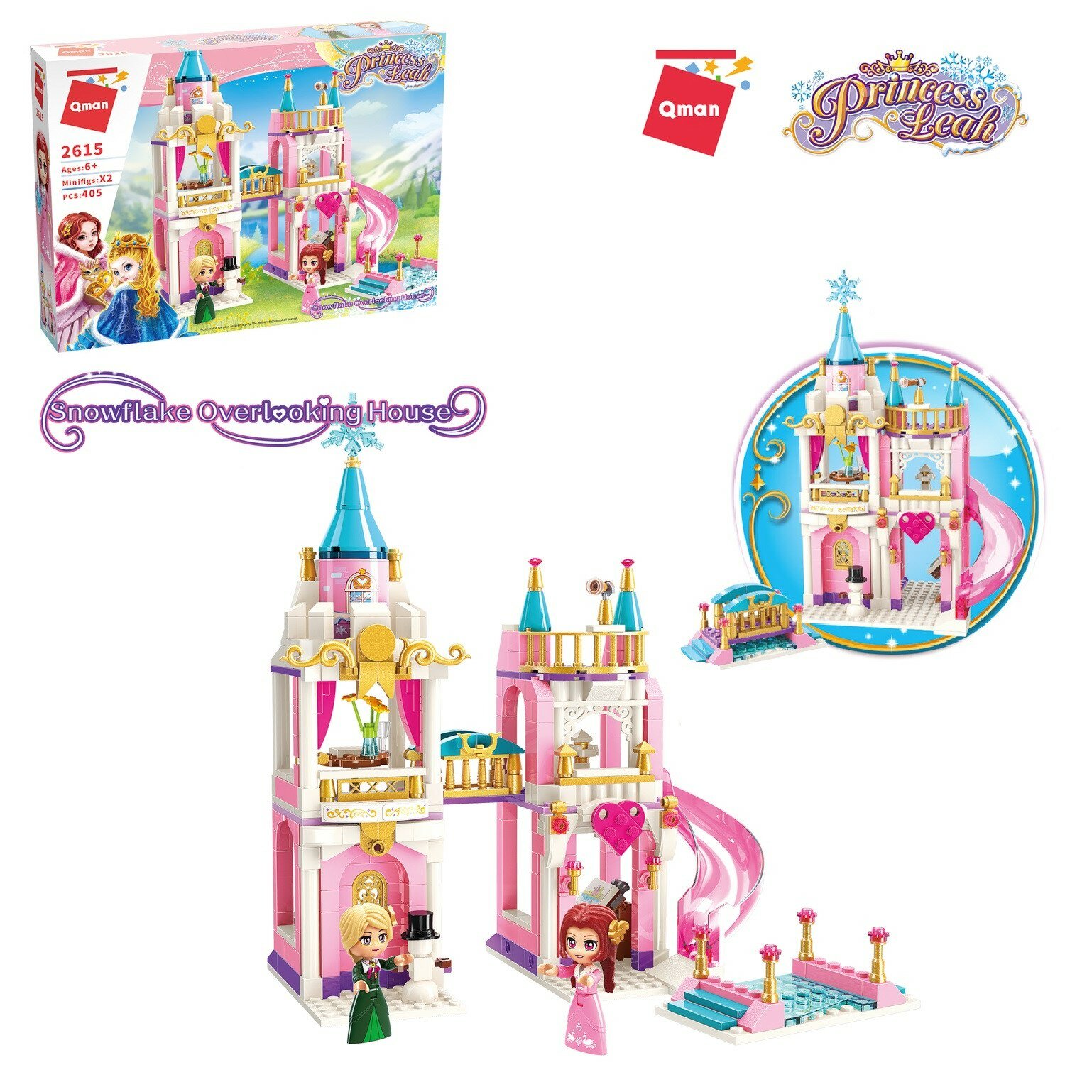 Из конструктора от бренда QMAN из серии «Princess Leah» ребенок может собрать собственными руками замечательный замок прекрасной принцессы. Предусмотрены два варианта сборки замка. Простое и надежное соединение деталей разных размеров и форм между собой обеспечат специальные крепления. Во время игры ребенок сможет задействовать свою фантазию и придумать интересные сценарии. В процессе сборки и игры с готовой моделью юный конструктор будет развивать мелкую моторику рук, пространственное мышление, внимательность и усидчивость.