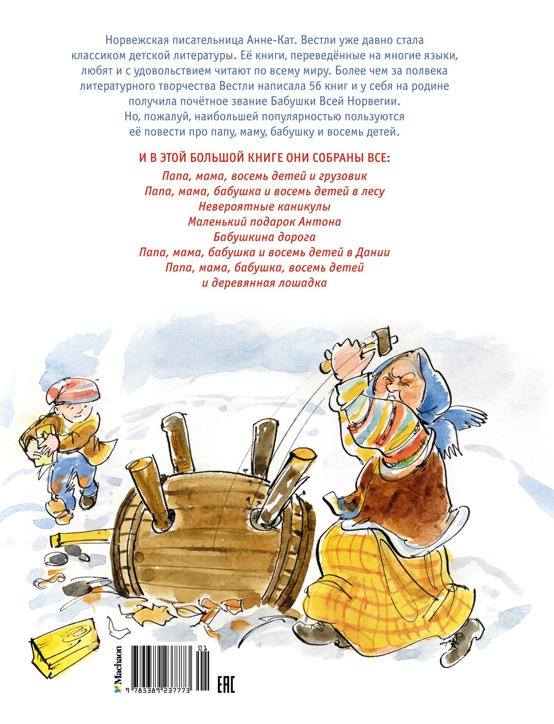 Норвежская писательница Анне-Катрине Вестли уже давно стала классиком детской литературы. Её книги, переведённые на многие языки, любят и с удовольствием читают по всему миру. Более чем за полвека литературного творчества Вестли написала 56 книг и у себя на родине получила почётное звание Бабушки Всей Норвегии. Но, пожалуй, наибольшей популярностью пользуются её повести про папу, маму, бабушку и восемь детей.