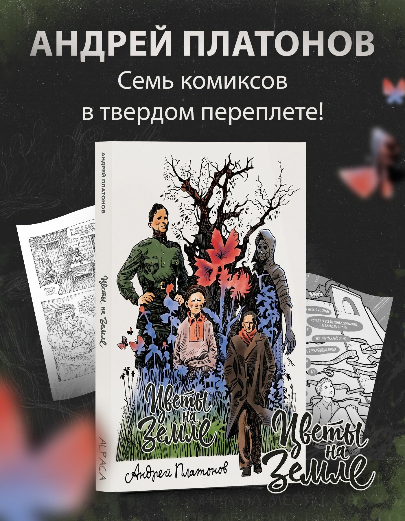 Книга «Цветы на земле» предлагает читателям обратиться к красоте его прозы через формат рисованных историй: в неё вошло семь графических адаптаций рассказов Платонова, выполненных Иваном Ешуковым, Антоном Савиновым, Дмитрием Нестераком, Натальей Коньшиной, Леонидом Блюммером, Захаром Ящиным и Дмитрием Нарожным.
