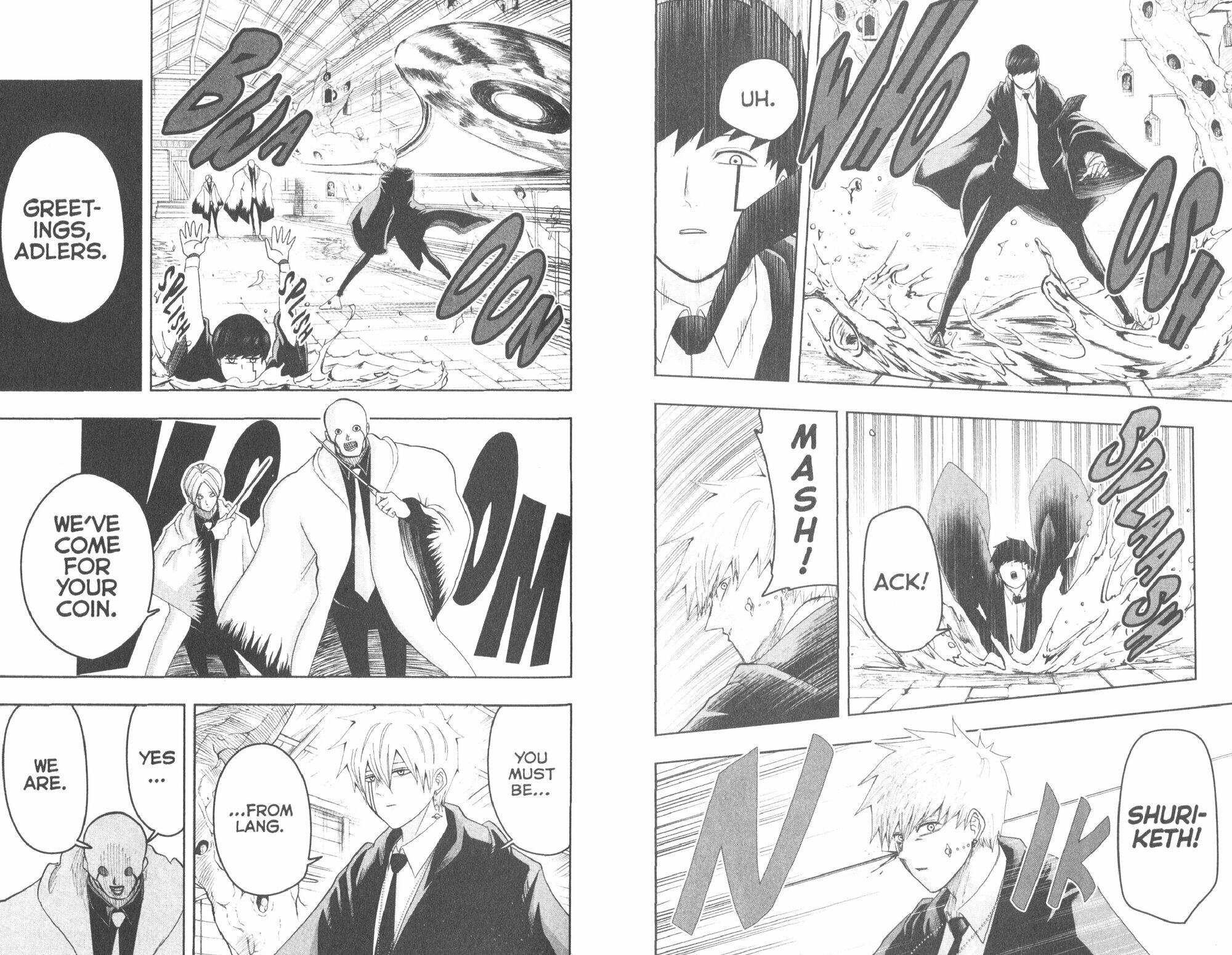 Lang’s vicious hunt for coins is in full swing! To stop them from monopolizing the chance to earn a Divine Visionary position, Mash teams up with his Adler compatriots. Afterwards, the Sixth and Seventh Fangs of the Magia Lupus swoop in to attack Mash while he’s cleaning the owl huts. Then, when his friends become the next victims of the Magia Lupus’s callous dog-eat-dog philosophy, an enraged Mash is ready to face them head-on!