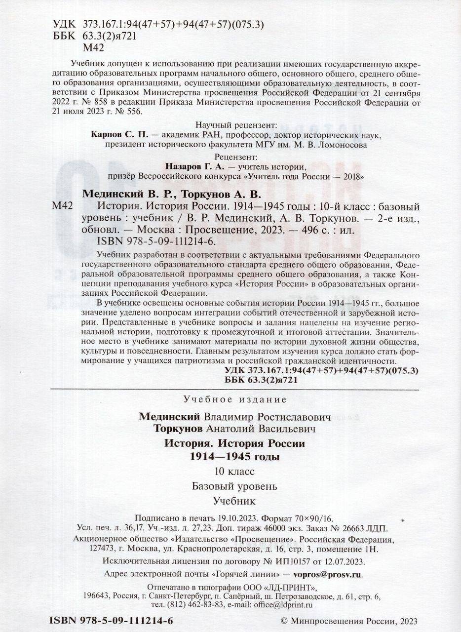 История. История России. 1914-1945 годы. 10 класс. Учебник (Чубарьян Александр Оганович, Мединский Владимир Ростиславович); Просвещение, 2023