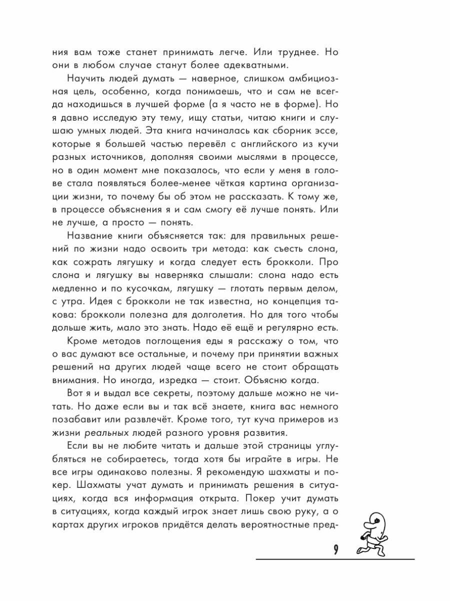 Для правильных решений надо освоить три метода: как съесть слона, как сожрать лягушку и когда следует есть брокколи. Про слона и лягушку вы наверняка слышали: слона надо есть медленно и по кусочкам, а лягушку — глотать первым делом, с утра. Идея с брокколи не так известна, но концепция такая: брокколи полезна для долголетия. Но для того чтобы дольше жить, мало это знать. Надо ее еще и регулярно есть.