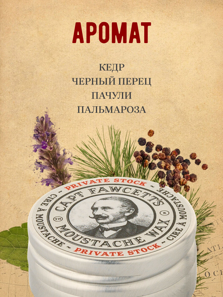 Captain Fawcett Private Stock Moustache Wax - имеет приятную текстуру, которая хорошо размягчается под воздействием тепла и легко распределяется по усам, придавая форму, блеск и делая их просто совершенными. Натуральные ухаживающие компоненты в составе, такие как природные воски и эфирные масла, обеспечивают достойный уход и защиту от неблагоприятных внешних факторов. Аромат: кедра, черного перца, теплых пачули и пальмарозы.