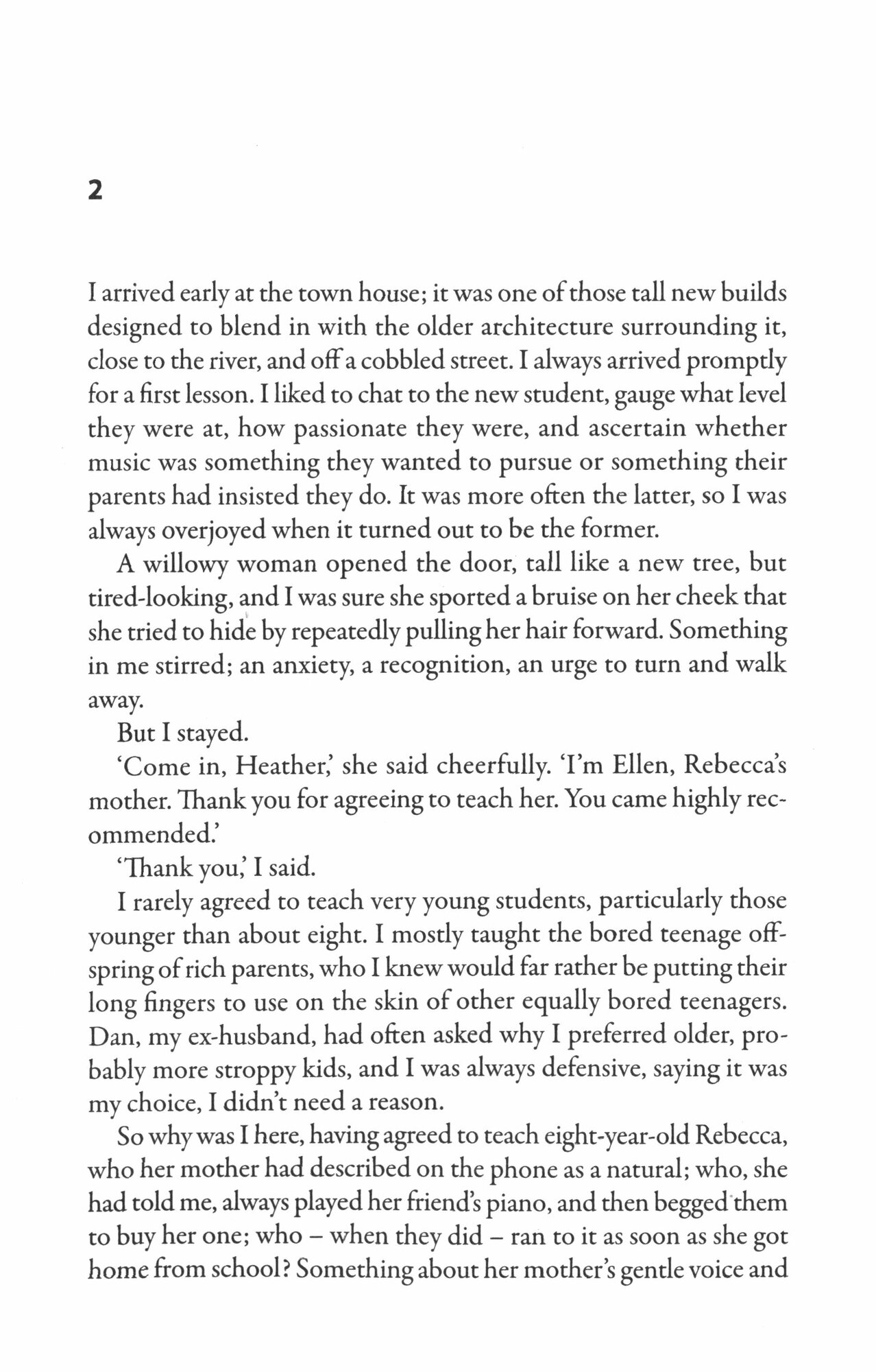 Heather Harris is a piano teacher and professional musician, whose quiet life revolves around music, whose memories centre on a single song that haunts her. A song she longs to perform again. A song she wrote as a child, to drown out the violence in their home. A song she played with her little sister, Harriet.
