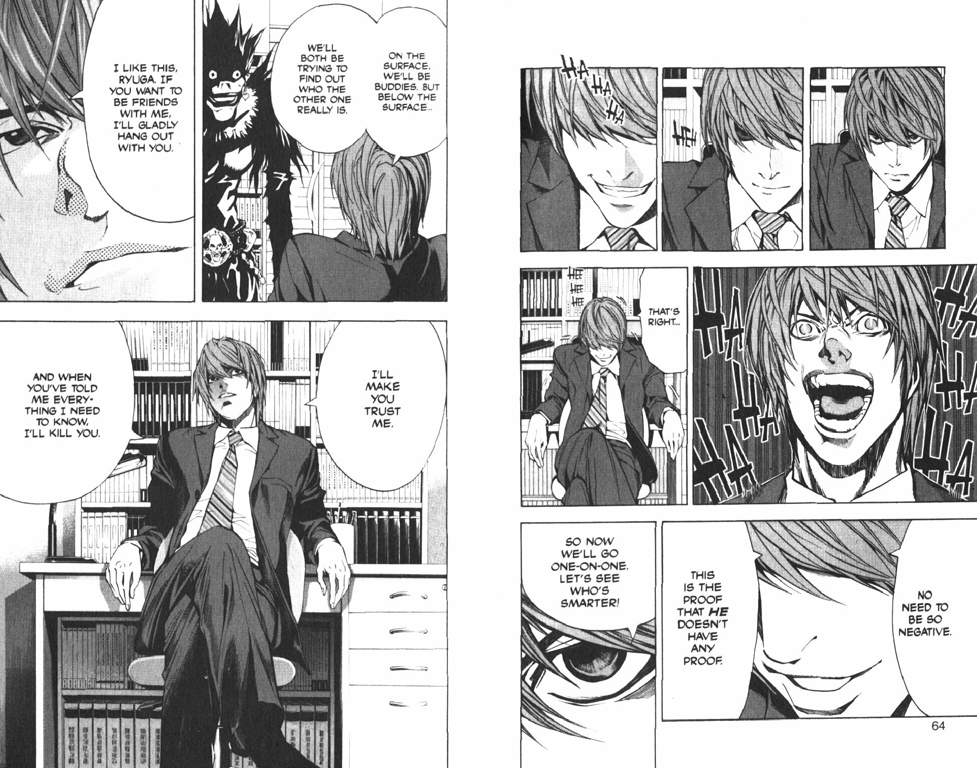 Light is chafing under L's extreme surveillance, but even 64 microphones and cameras hidden in his room aren't enough to stop Light. He steps up the game, but before the battle of wits can really begin, a family emergency distracts him. But even though Light isn't using the Death Note right now, someone else is! Who's the new 'Kira' in town?