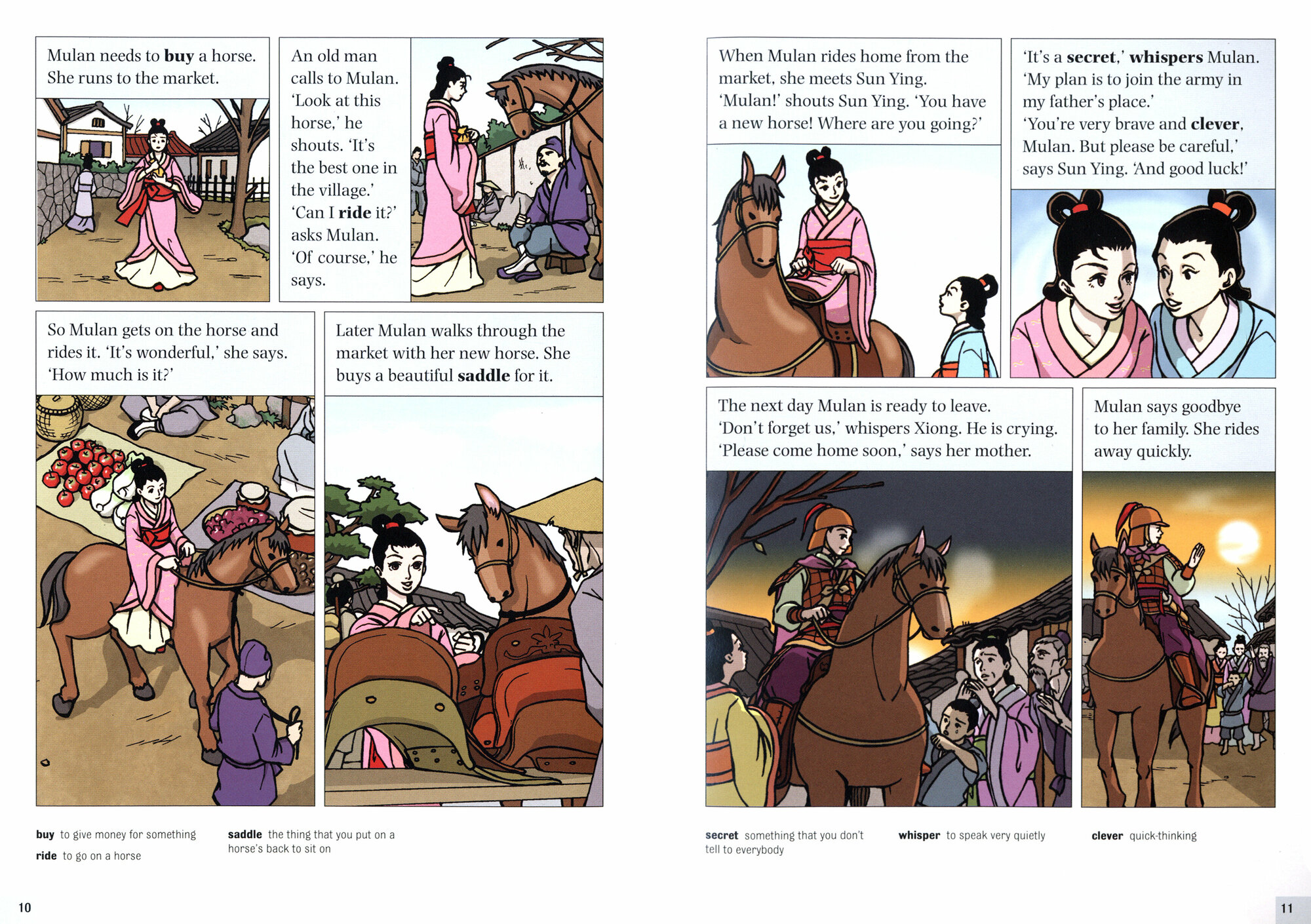 When the Emperor calls every man to join the army and fight the enemy, Mulan's father is old and ill, and cannot go. Wearing men's clothes and riding a horse, Mulan leaves her family and fights bravely for the Emperor in her father's place. She is soon a hero for all the soldiers in the Chinese army. One of them, Ye Ming, is her best friend. But does he know that she is a woman? And can Mulan fall in love with a friend?