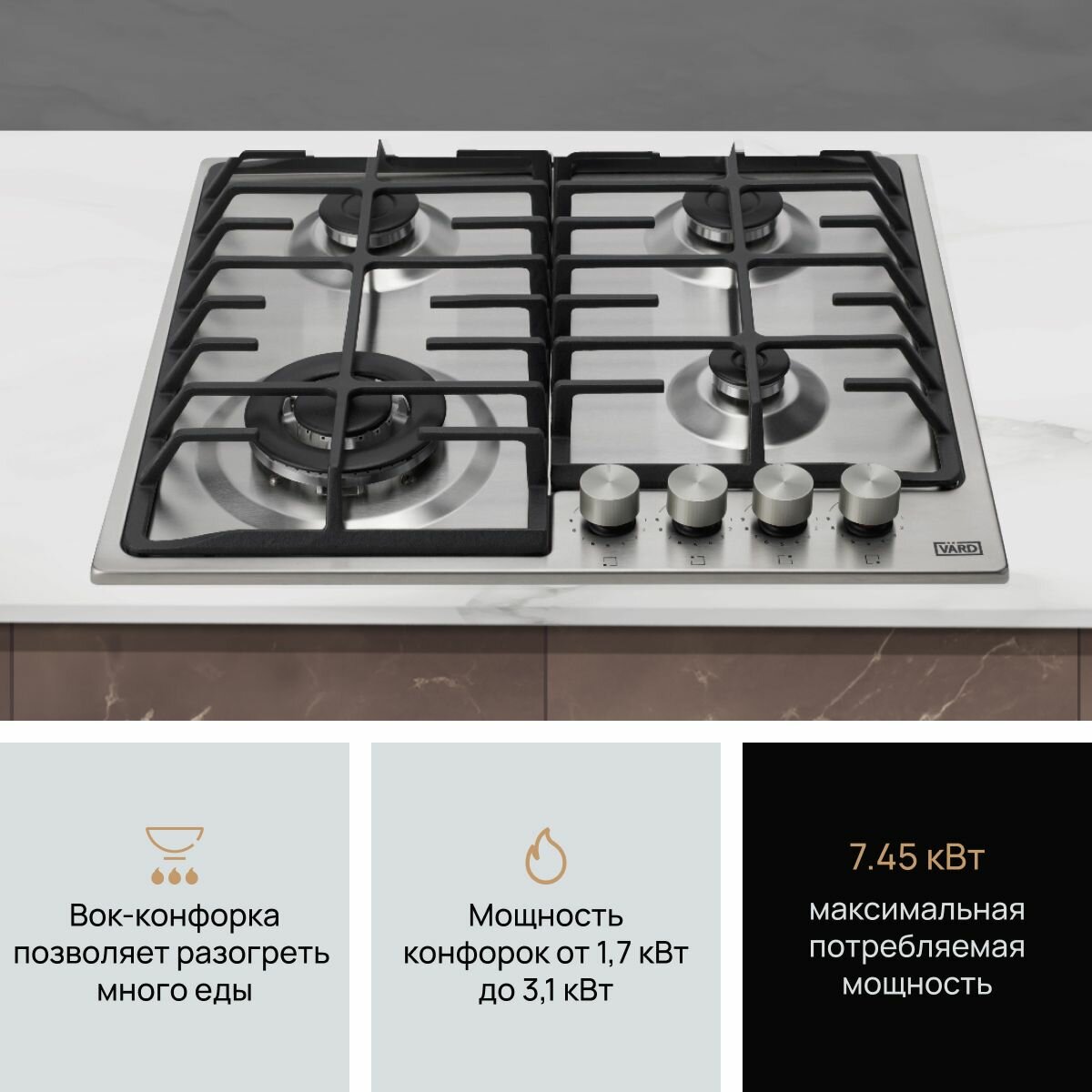 Газовая варочная панель на металле VARD Газовая варочная панель – надежный и удобный инструмент, который поможет вам приготовить вкусные и разнообразные блюда. Изготовлена она из качественной нержавеющей стали, что придает ей элегантный внешний вид и позволяет легко ухаживать за поверхностью. Снабжена ступенчатыми регуляторами StepFlame, которые позволяют точно регулировать мощность горения газа, обеспечивая идеальный нагрев. Ширина варочной панели составляет 60 сантиметров, что делает ее компактной и удобной в использовании.Держатели для посуды выполнены из прочного чугуна, что обеспечивает стабильную и надежную основу для кастрюль и сковородок. Наличие газконтроля и автоматического автоподжига делает использование панели безопасным и удобным.Кроме того, варочная панель оборудована WOK конфоркой, которая позволяет легко готовить блюда в специальных кастрюлях для воков. Изделие также включает 4 конфорки, обеспечивая достаточное количество места для приготовления нескольких блюд одновременно.Варочная панель – это идеальное решение для любой кухни, объединяющее в себе надежность, функциональность и простоту использования. Благодаря своим характеристикам, она станет незаменимым помощником в создании вкусных и качественных блюд.