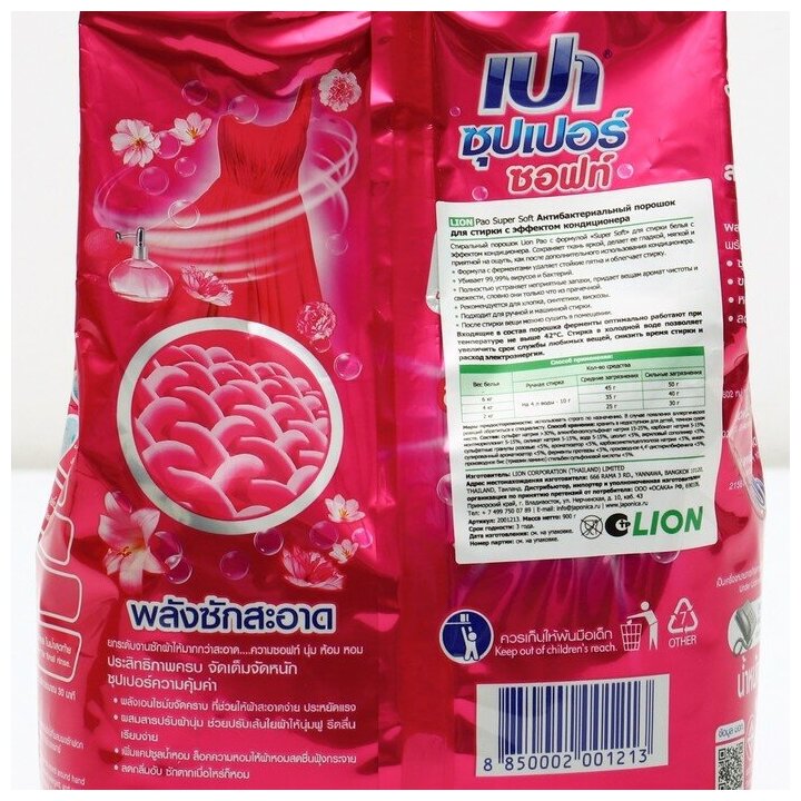 Стиральный порошок Lion Pao с формулой Super Soft для стирки белья с эффектом кондиционера. Сохраняет ткань яркой, делает ее гладкой, мягкой и приятной на ощупь, как после дополнительного использования кондиционера. Формула с ферментами удаляет стойкие пятна и облегчает стирку. Убивает 99,99% вирусов и бактерий. Полностью устраняет неприятные запахи, придает вещам аромат чистоты и свежести, словно они только что из прачечной. Рекомендуется для хлопка, синтетики, вискозы. Подходит для ручной и машинной стирки. После стирки вещи можно сушить в помещении.