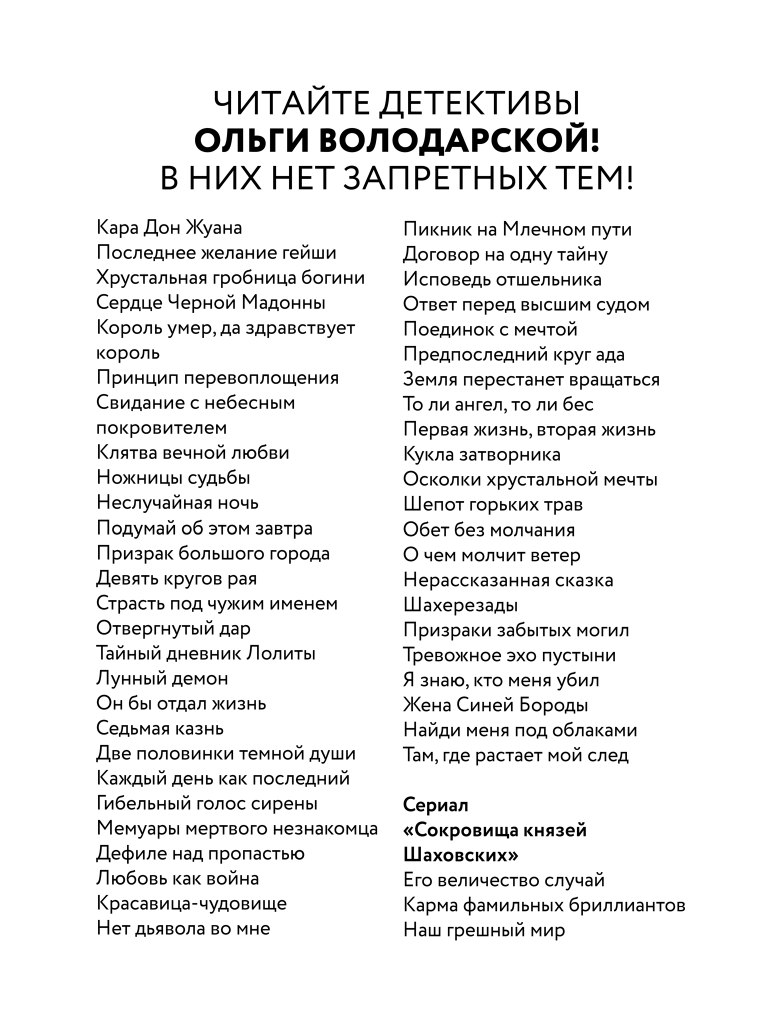 Романы Ольги Володарской — остросоциальные детективы, в которых автор препарирует все стороны жизни современного общества, ничего не скрывая и ни о чем не умалчивая. Ее книги написаны так увлекательно, что оторваться просто невозможно. Яркий сочный язык и блестящий авторский стиль создают неповторимую атмосферу, в которую с головой погружается читатель.