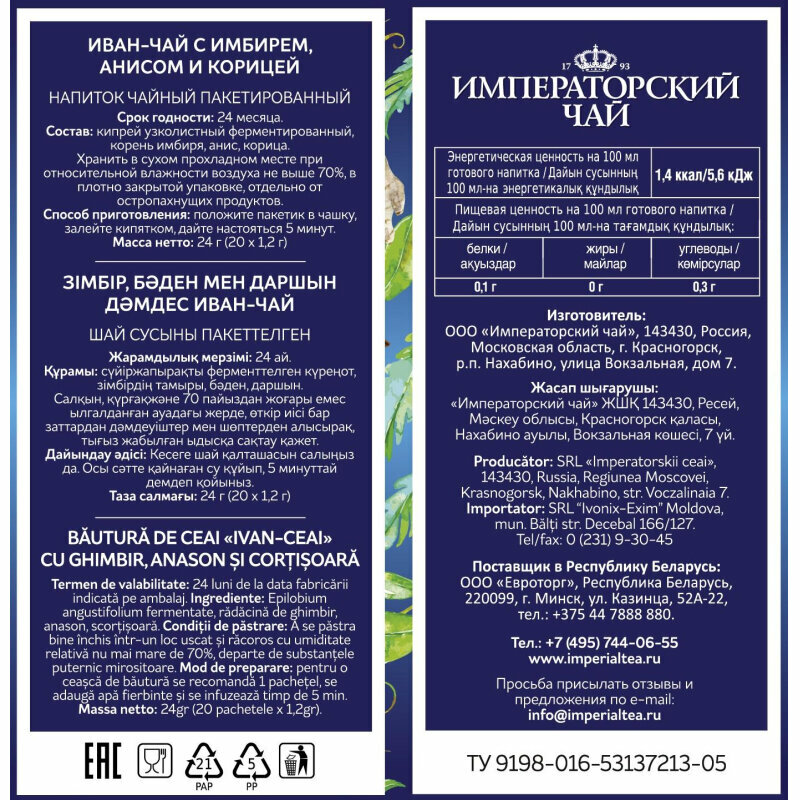 | Состав | Кипрей узколистный ферментированный, корень имбиря, анис, корица. |