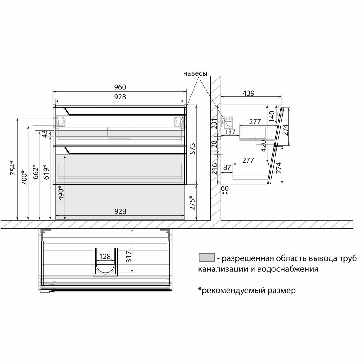 - Габариты корпуса тумбы (ШхВхГ): 960х575х439 мм.