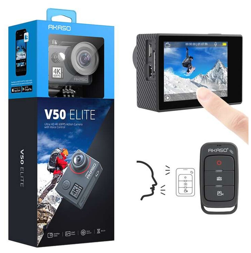 | Комплект поставки | 1x AKASO V50 Elite Action Camera, 1x Пульт управления, 2x 1050 мАч аккумулятора, 1x Влагозащитный чехол, 1x ЗУ для аккумуляторов, 1x Крепление для велосипеда, 6x различных креплений, 2x 2-х сторонняя клейкая лента, 2x Крепления для шлема, 1x Ремешок, 5x Стяжки, 1x Защитная задняя крышка, 1x USB-C кабель, 1x Тряпочка для протирки линзы, 1x Quick Reference Guide |