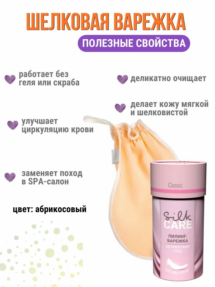 А с варежкой Вы забудете о других способах обновления кожи и подарите ей нежность шелка с нашей массажной чудо скраб варежкой для пилинга тела и лица. Для создания spa варежки Beauty Face/Classic/Classic&delicate Silk Care мы выбрали идеальную зернистость поверхности для сохранения молодости кожи, ее освобождения от целлюлита и прыщей. Натуральные волокна и особая структура ткани будут эффективно скатывать отмершую кожу за счет особой крутки шелковой нити. Натуральный шелк органза/крепдешин/крепдешин с атласом подходит для любого типа кожи и даже применяется в комплексе процедур при ""гусиной коже"", гиперкератозе. Он гипоаллергенный, не царапает кожу в отличие от рукавиц кесе и кесса, антибактериален, сохраняет естественный РН-баланс кожи и не имеет отдушек. Как подходить к процессу и достичь максимального эффекта обновления кожи? Хорошо распарьтесь под душем, в ванне, сауне или бане и потрите кожу влажной шероховатой рукавицей. Мыло или гель для мытья тела вам не понадобятся, оставьте их в стороне, ведь совместное использование моющих средств и мочалок с нашей шелковой губкой будет способствовать потере ее полезных свойств. После того как закончите отшелушивать, смойте скатанные частички омертвевшей кожи и обязательно нанесите увлажняющий крем. Он хорошо впитается и закрепит антицеллюлитный эффект от процедуры. Применяйте раз в 1-3 недели. Кожа станет чистой, мягкой, шелковистой, разгладится рельеф и улучшится цвет. Тело скажет «спасибо», если введёте этот ритуал в список регулярных: смягчатся огрубевшие локти и колени, а вросшие волоски на ногах или интимных зонах начнут отмирать и больше вас не побеспокоят. Перчатка Silk Care рассчитана на 25-30 уходовых процедур.