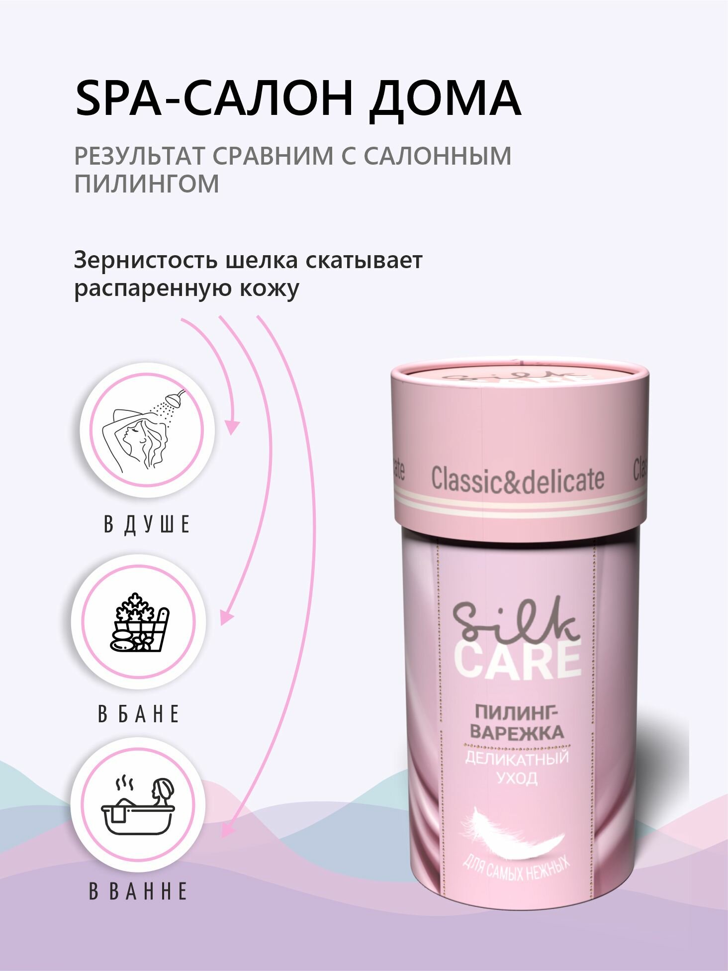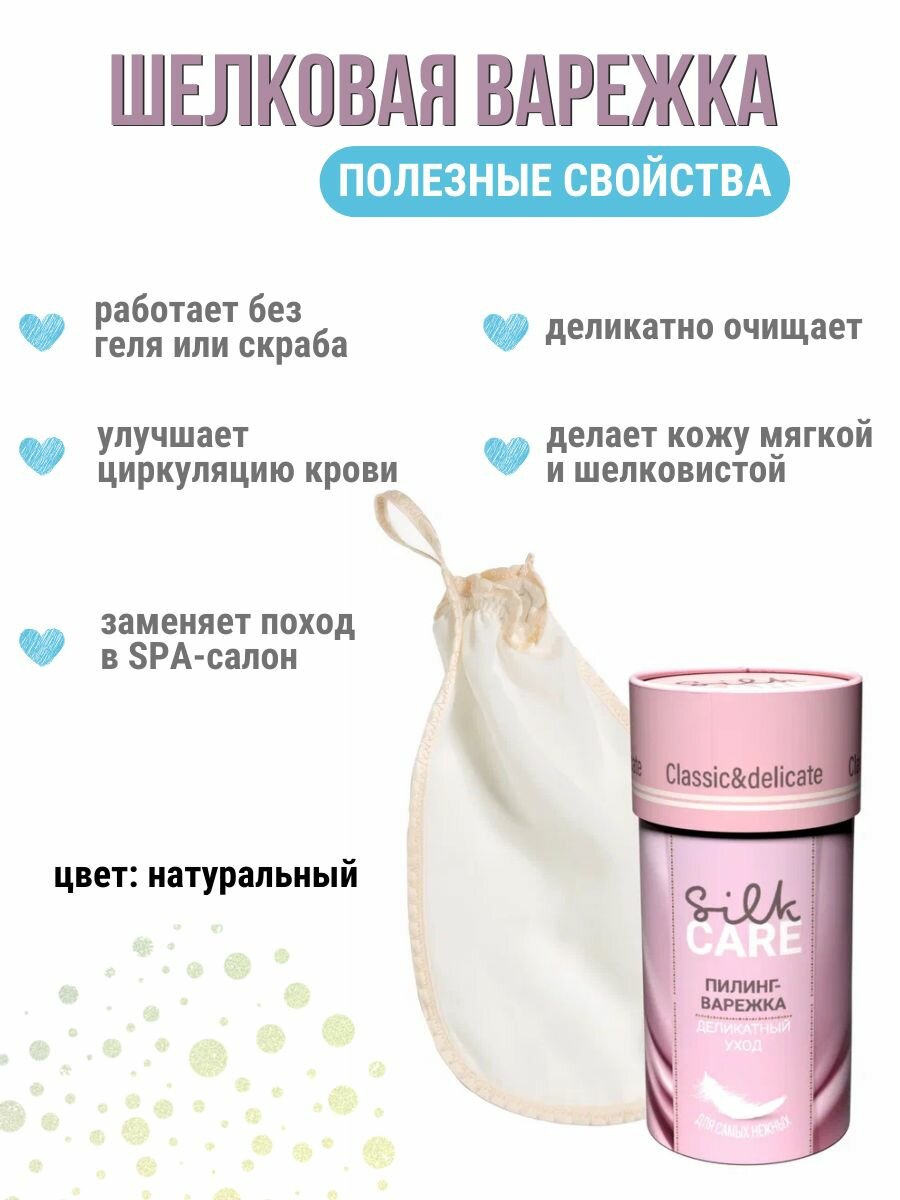 А с варежкой Вы забудете о других способах обновления кожи и подарите ей нежность шелка с нашей массажной чудо скраб варежкой для пилинга тела и лица. Для создания spa варежки Beauty Face/Classic/Classic&delicate Silk Care мы выбрали идеальную зернистость поверхности для сохранения молодости кожи, ее освобождения от целлюлита и прыщей. Натуральные волокна и особая структура ткани будут эффективно скатывать отмершую кожу за счет особой крутки шелковой нити. Натуральный шелк органза/крепдешин/крепдешин с атласом подходит для любого типа кожи и даже применяется в комплексе процедур при ""гусиной коже"", гиперкератозе. Он гипоаллергенный, не царапает кожу в отличие от рукавиц кесе и кесса, антибактериален, сохраняет естественный РН-баланс кожи и не имеет отдушек. Как подходить к процессу и достичь максимального эффекта обновления кожи? Хорошо распарьтесь под душем, в ванне, сауне или бане и потрите кожу влажной шероховатой рукавицей. Мыло или гель для мытья тела вам не понадобятся, оставьте их в стороне, ведь совместное использование моющих средств и мочалок с нашей шелковой губкой будет способствовать потере ее полезных свойств. После того как закончите отшелушивать, смойте скатанные частички омертвевшей кожи и обязательно нанесите увлажняющий крем. Он хорошо впитается и закрепит антицеллюлитный эффект от процедуры. Применяйте раз в 1-3 недели. Кожа станет чистой, мягкой, шелковистой, разгладится рельеф и улучшится цвет. Тело скажет «спасибо», если введёте этот ритуал в список регулярных: смягчатся огрубевшие локти и колени, а вросшие волоски на ногах или интимных зонах начнут отмирать и больше вас не побеспокоят. Перчатка Silk Care рассчитана на 25-30 уходовых процедур.
