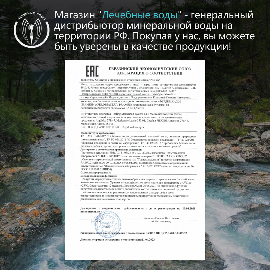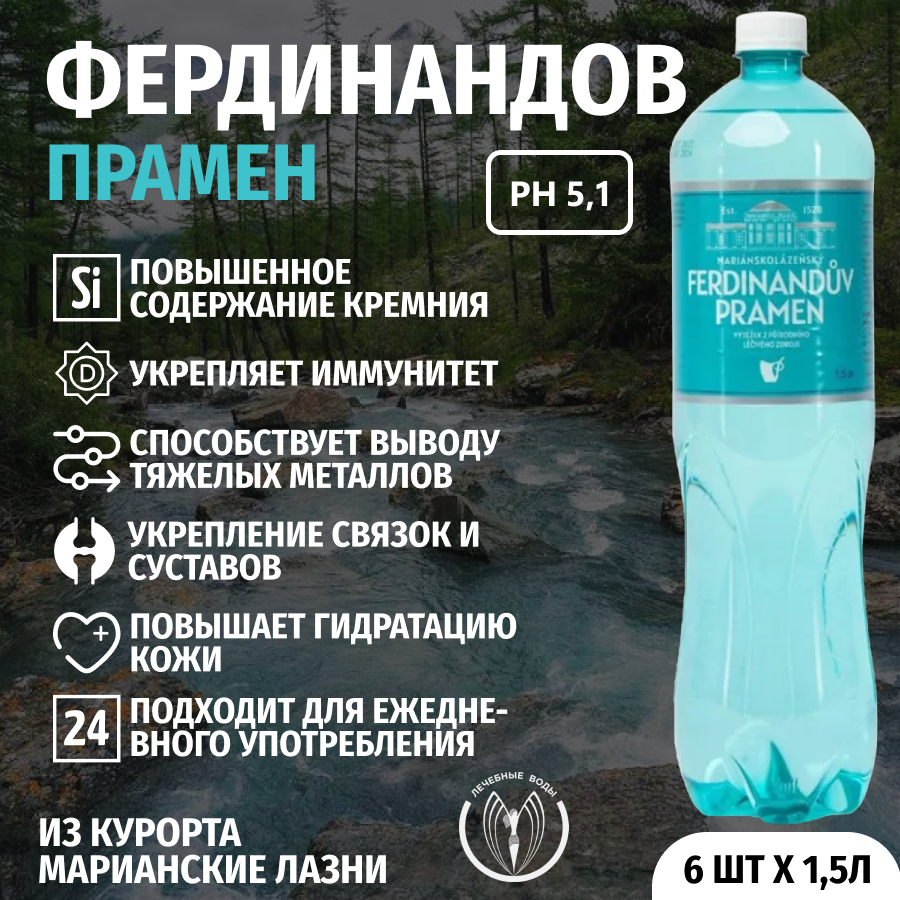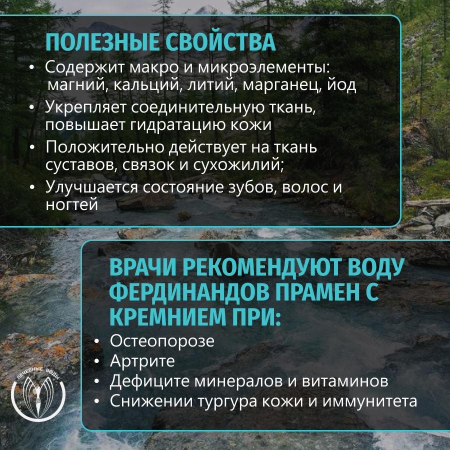 Богатый минеральный состав Фердинанда Прамена предупреждает минеральные дефициты, помогая организму адаптироваться и быстрее восстанавливаться после неблагоприятных воздействий (стресс, вирусные и хронические заболевания, плохая экология). Вода содержит кремниевую кислоту, йод, магний, кальций, литий, марганец – необходимые для жизни минералы, которые в присутствии природной газации хорошо усваиваются организмом. Вода сохраняет прочность связок и костей, подвижность суставов, защищает организм от вредных соединений (солей тяжелых металлов), укрепляет иммунитет. Кремниевая кислота – верный помощник для поддержания молодости и здоровья кожи за счет укрепления соединительной ткани и усиления гидратации. Кроме того, при употреблении Фердинандов Прамен в качестве постоянного питья, значительно улучшается внешний вид и состояние волос, ногтей и зубов. Полезная вода для всех членов семьи – это Фердинандов Прамен!