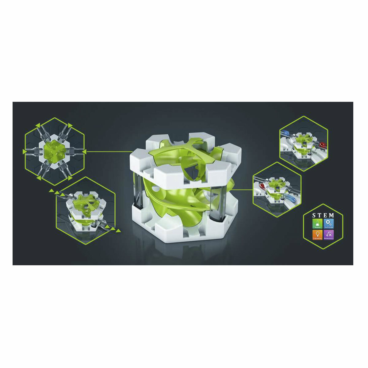 В сочетании со стартовым набором можно строить захватывающие трассы, не мешая шарикам друг другу на пути к финишу.